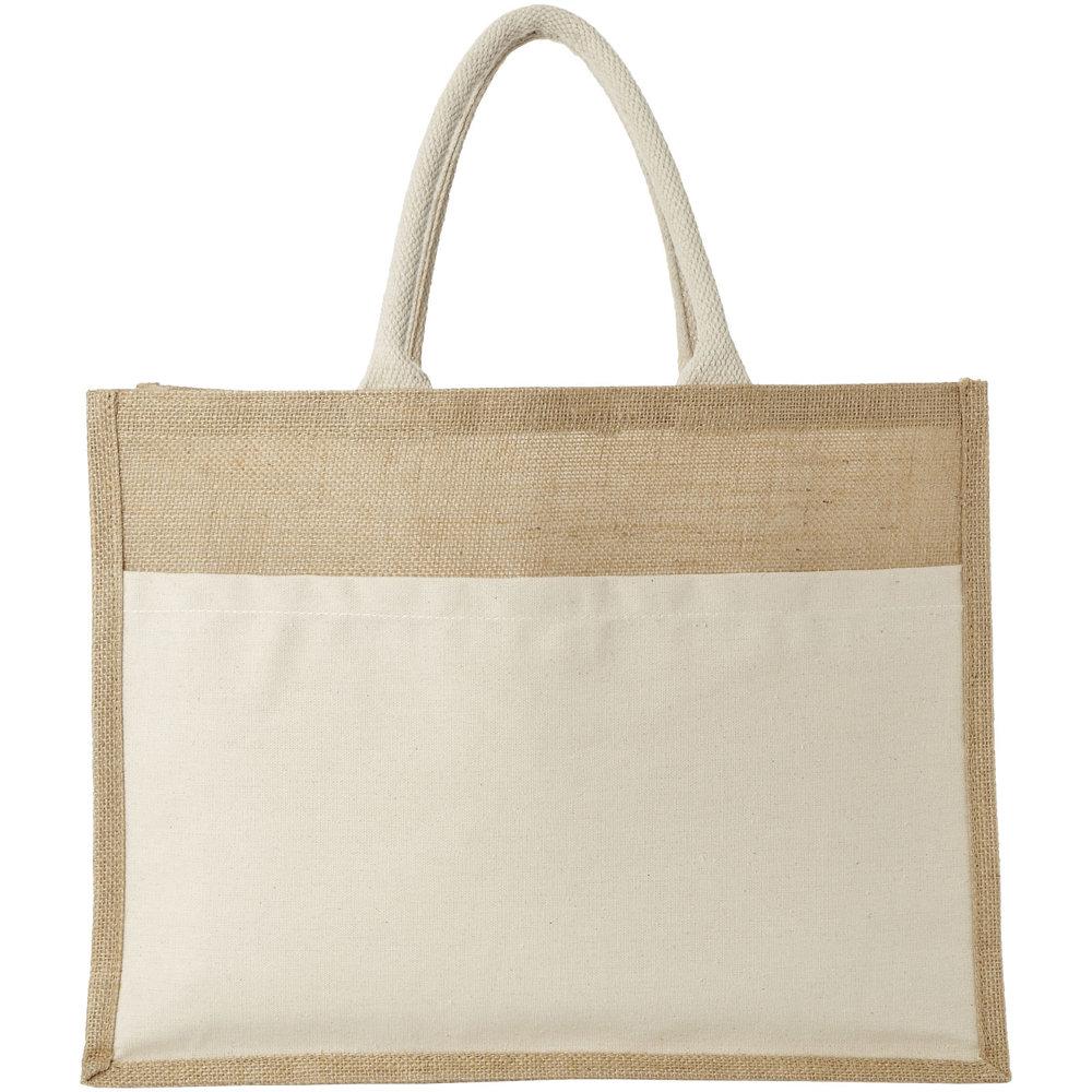 Ontdek de Mumbay jute draagtas met katoen voorvak 18L, jouw ideale gepersonaliseerde relatiegeschenk. Gemaakt van een stevige mix hoogwaardig katoen en jute met 320 g/m², is deze tas superduurzaam en draagt hij moeiteloos tot 10 kg. Het ruime hoofdvak van 18 liter slikt al je dagelijkse essentials zoals laptop, boeken, gymkleding en waterfles, terwijl het handige voorvak snelle toegang biedt tot kleinigheden.