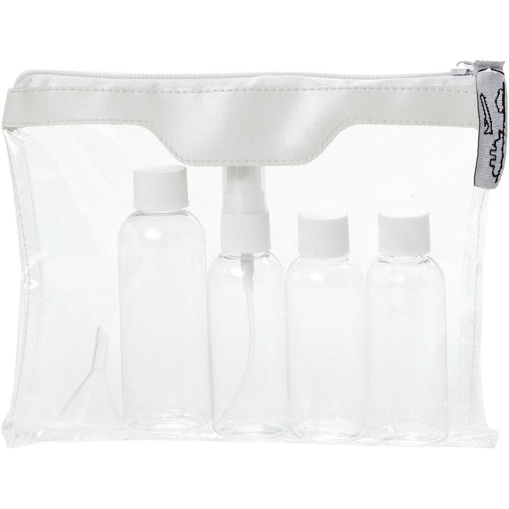 Ontdek deze praktische toilettas die perfect past in je handbagage. Je krijgt een complete set met 2 flesjes van 50 ml, 1 flesje van 90 ml en 1 spray met trechter, allemaal netjes verpakt in een aparte polybag voor extra hygiëne.