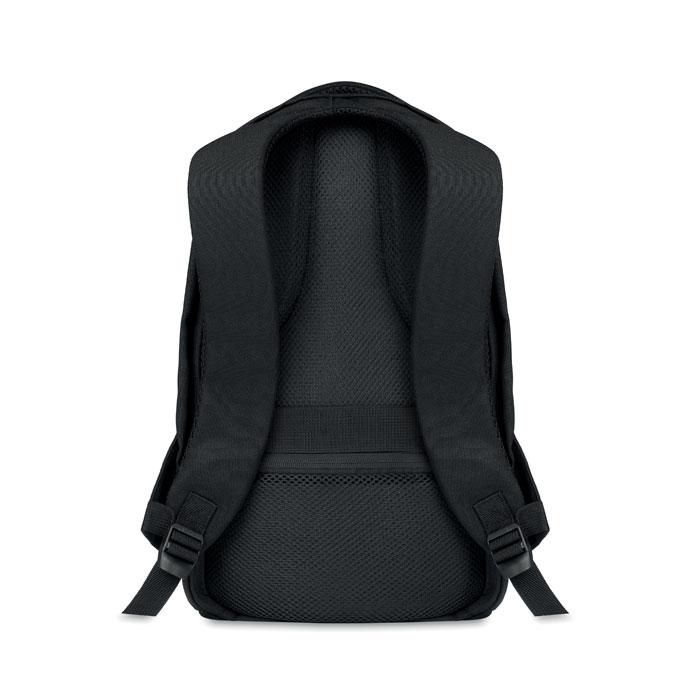 Rugzak van 600D RPET met groot hoofd compartiment met ruimte voor een 13 inch laptop, ritssluiting op de rugzijde voor extra veiligheid en gewatteerde schouderbanden voor meer draagcomfort.