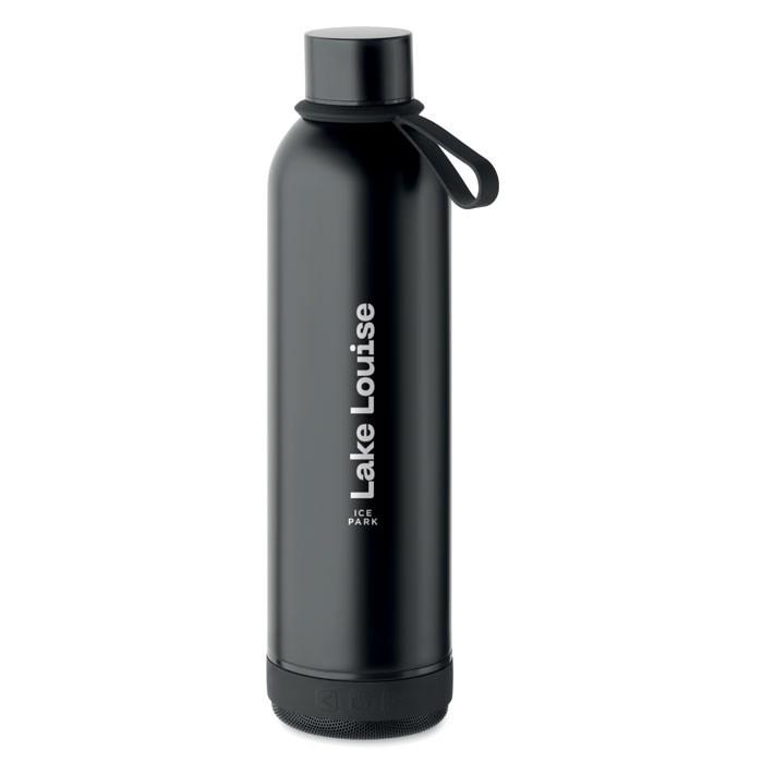 Dubbelwandige vacuüm isolerende fles van gerecycled roestvrij staal (90% gerecycled roestvrij staal en 10% roestvrij staal) en siliconen handvat met afneembare 3W draadloze speaker. Inhoud: 500ml. Batterij van 500 mAh. Verwijder de luidspreker voor reiniging. Lekvrij.