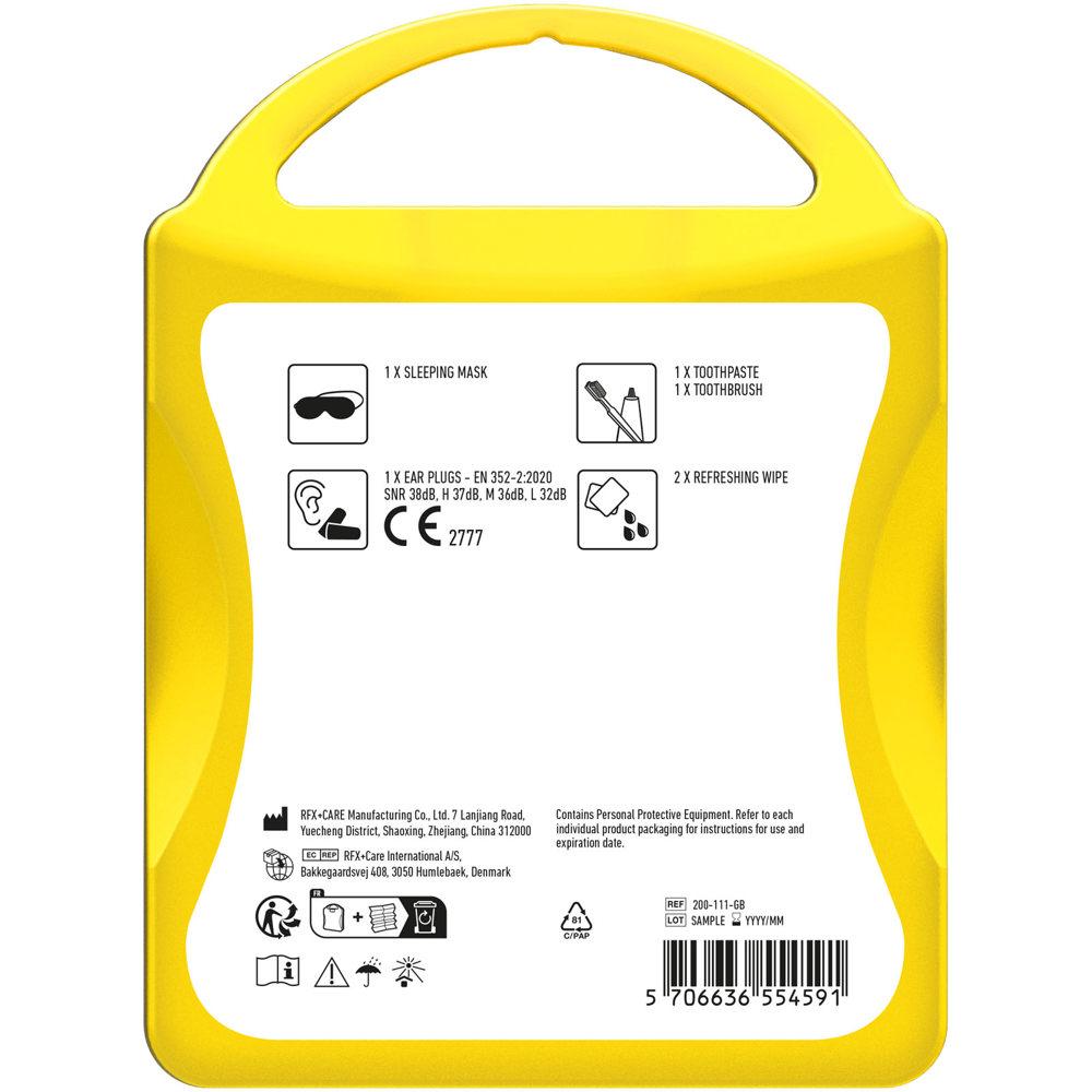De ideale reisset voor elke reis. Met deze set kun je jezelf kom je fris en ontspannen aan op je bestemming. Inhoud: 1 oogpads, 1 paar oordopjes, 2 verfrissende doekjes. Alle eerstehulp- en verzorgingsproducten in de kit voldoen aan alle geldende EU-voorschriften. Prijs is inclusief full colour bedrukking.