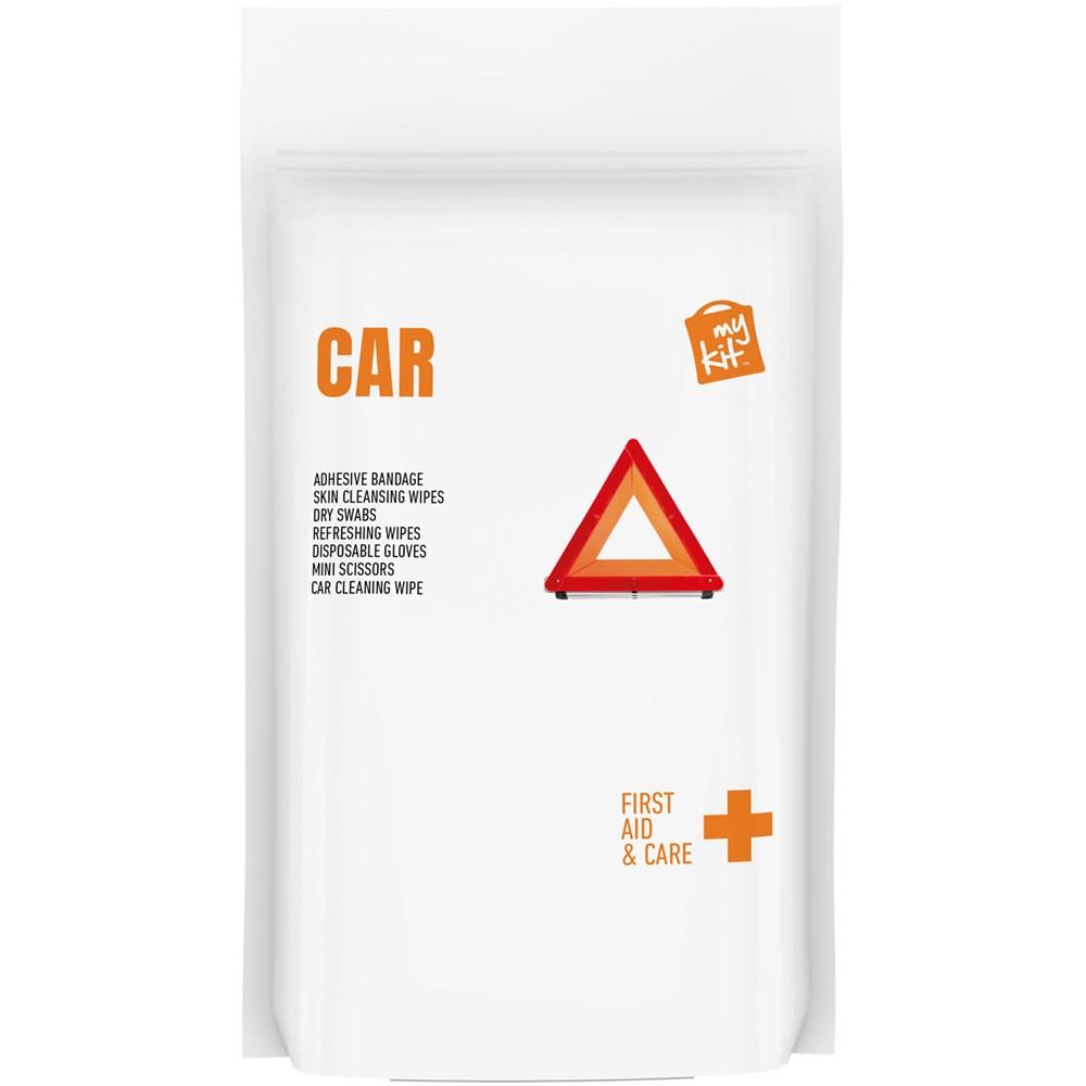 Dit is een ideale verbanddoos voor in elke auto. Met deze kit ben je voorbereid op kleine ongelukjes en verwondingen tijdens je reis. Inhoud: 12 waterbestendige pleisters, 2 huidreinigende wattenstaafjes, 2 droge wattenstaafjes, 1 paar wegwerphandschoenen, 1 autoreiniger (2-pak), 1 verfrissend doekje, 1 minischaar. Alle eerstehulp- en verzorgingsproducten in de kit voldoen aan alle geldende EU-voorschriften. Prijs is inclusief full colour bedrukking. Geleverd in een papieren stazak.
