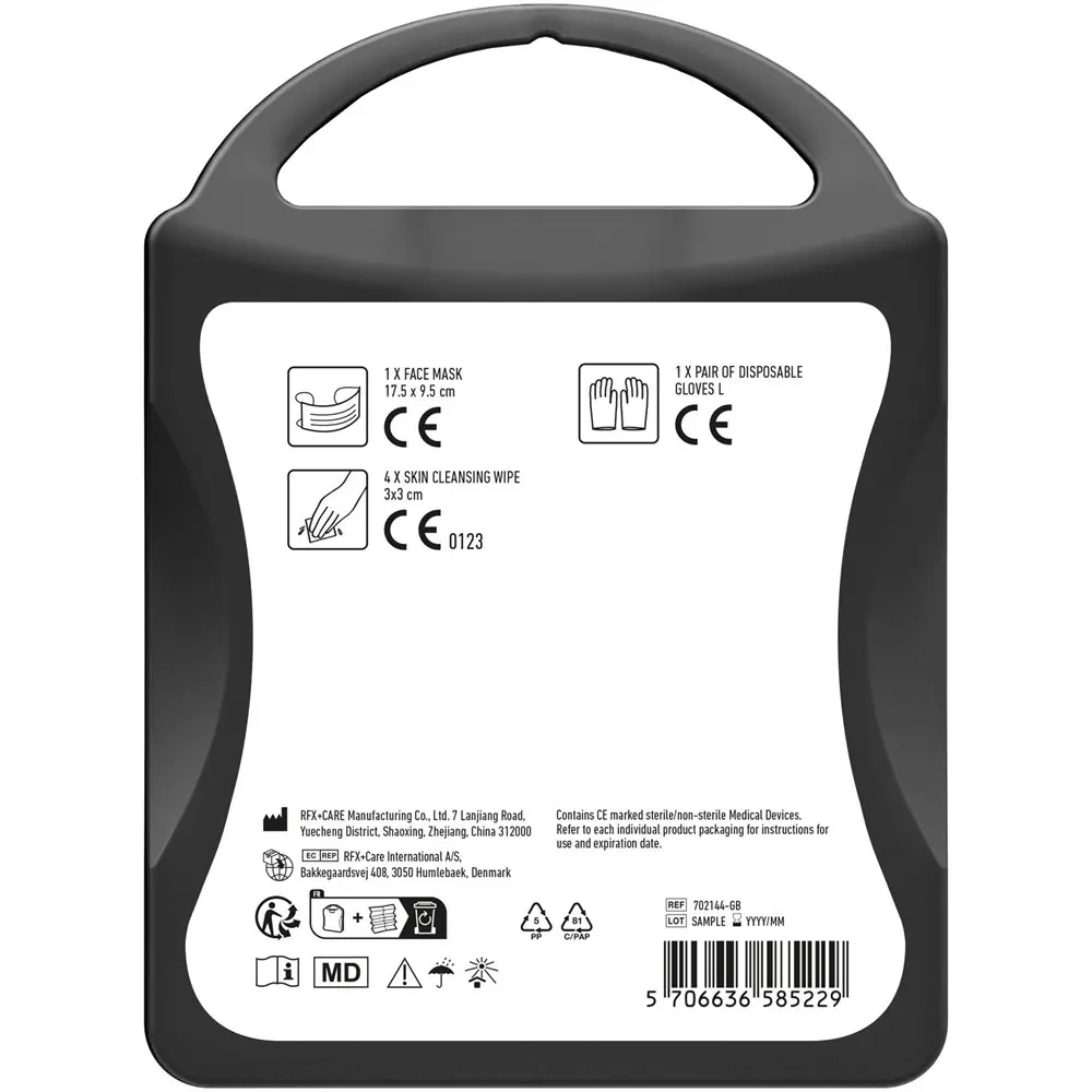 De kit bevat een mondmasker, vier handreinigende doekjes en een paar handschoenen. Alle artikelen voldoen aan de Europese regelgeving voor eerste hulp en verzorging, zodat u zeker bent van betrouwbare bescherming. Gemaakt van non-woven polypropyleen en PVC-kunststof, biedt het duurzame kwaliteit die uw klanten waarderen.