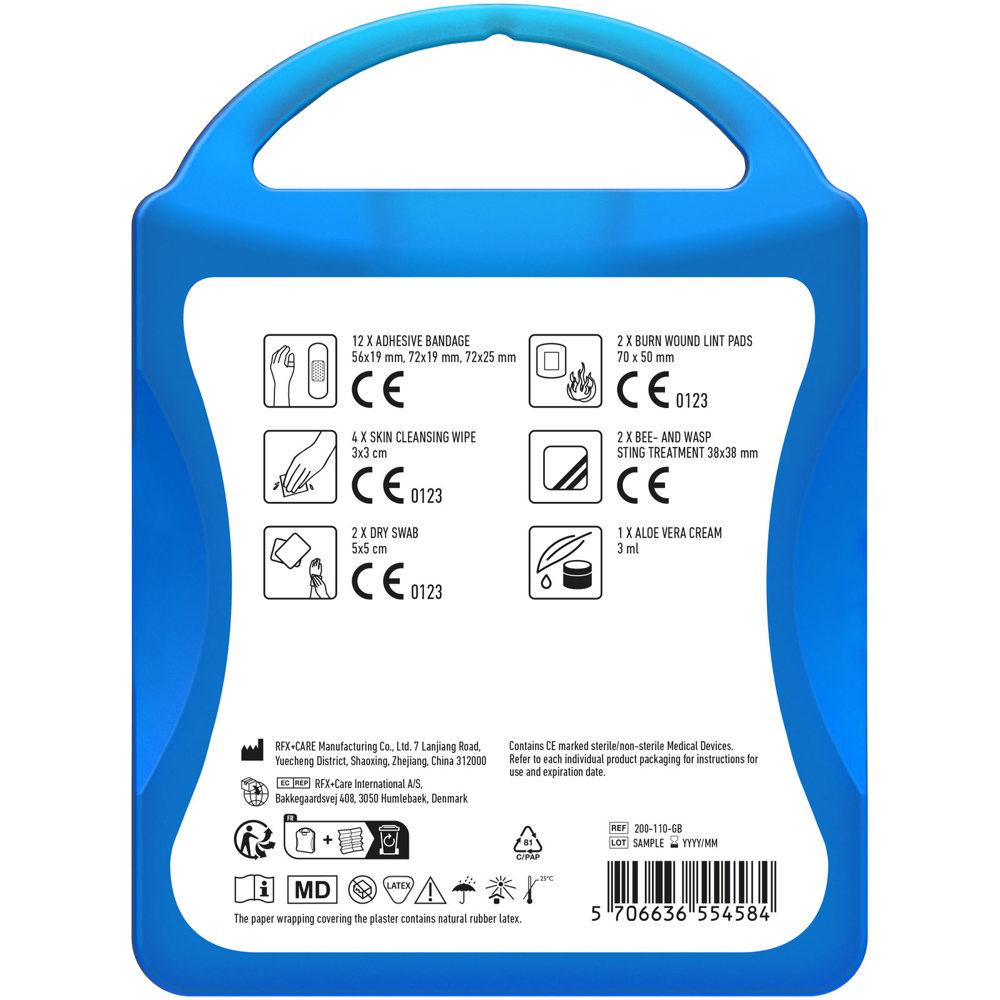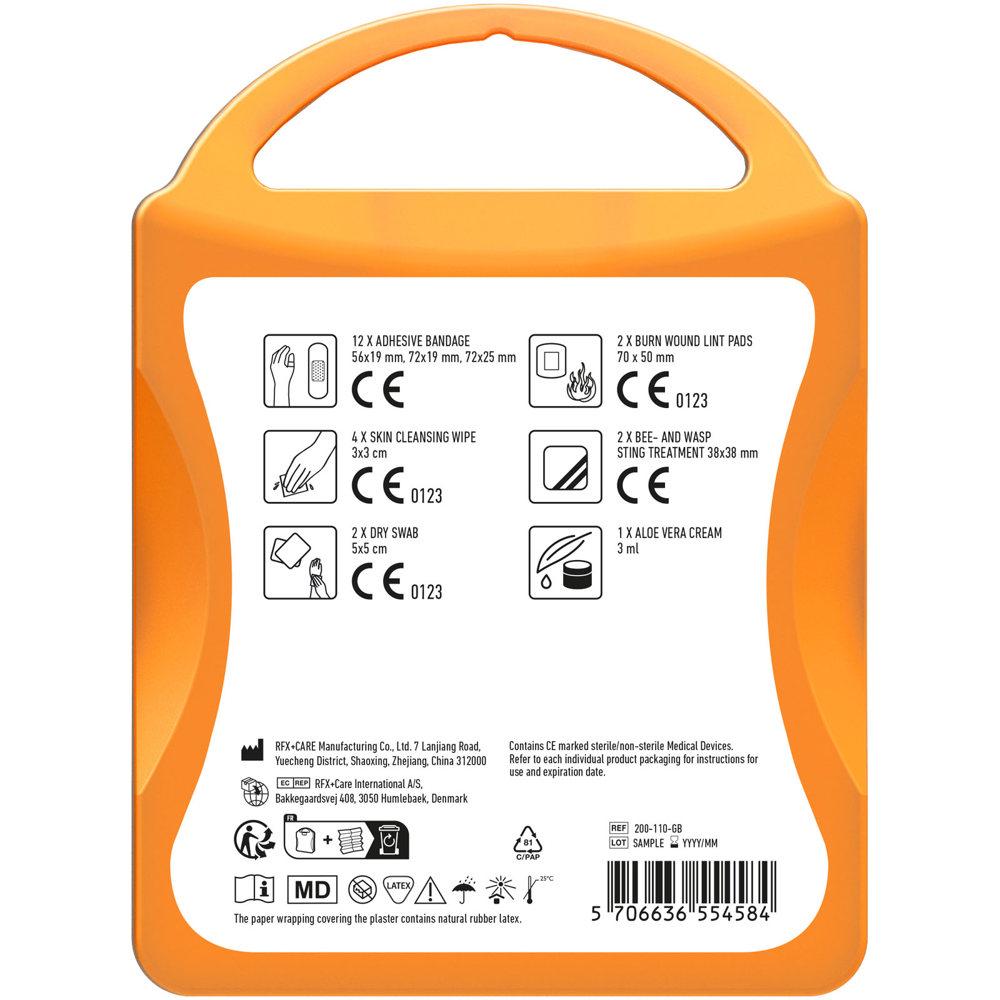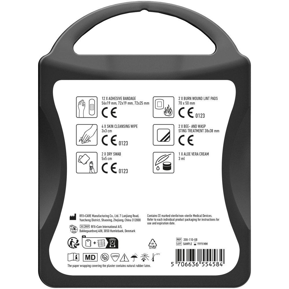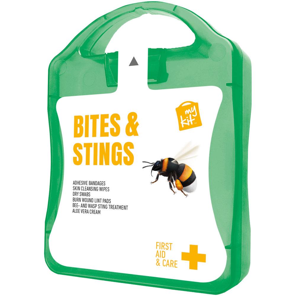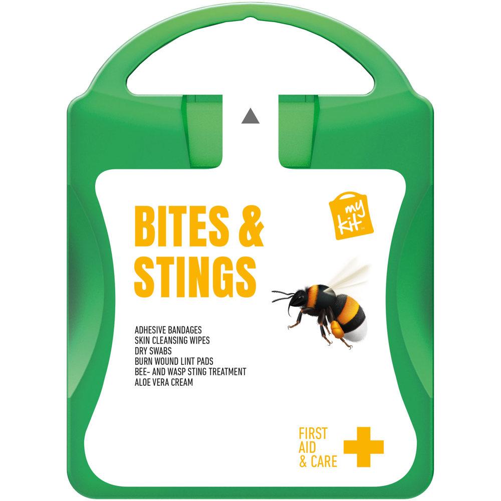 Je beveiligt je eventgangers of klanten perfect tegen zomerse insectenbeten met de MyKit Beten en Steken set. Deze compacte eerstehulpkit bevat 12 waterbestendige pleisters, 4 huidreinigende wattenstaafjes, 2 droge wattenstaafjes, 2 brandwondenpluiskompressen, 1 bijenpleister en 1 Aloë Vera crème – allemaal volgens EU-voorschriften.