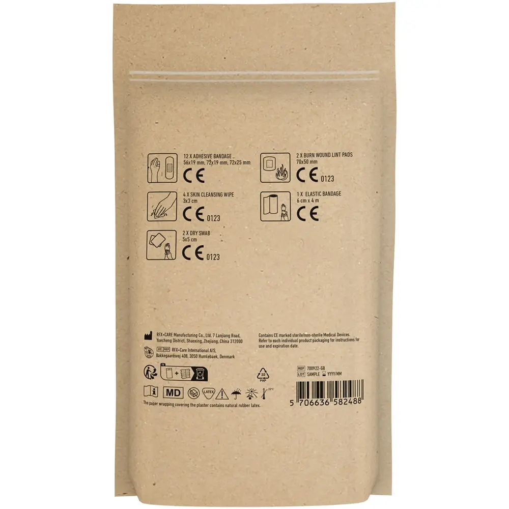 De kit bevat 12 waterbestendige pleisters, 4 vochtige reinigingsdoekjes, 2 droge reinigingsdoekjes, 1 elastisch verband en 2 brandwondencompressen. Alle artikelen voldoen aan de EU-regelgeving, zodat u veilig en betrouwbaar kunt geven.