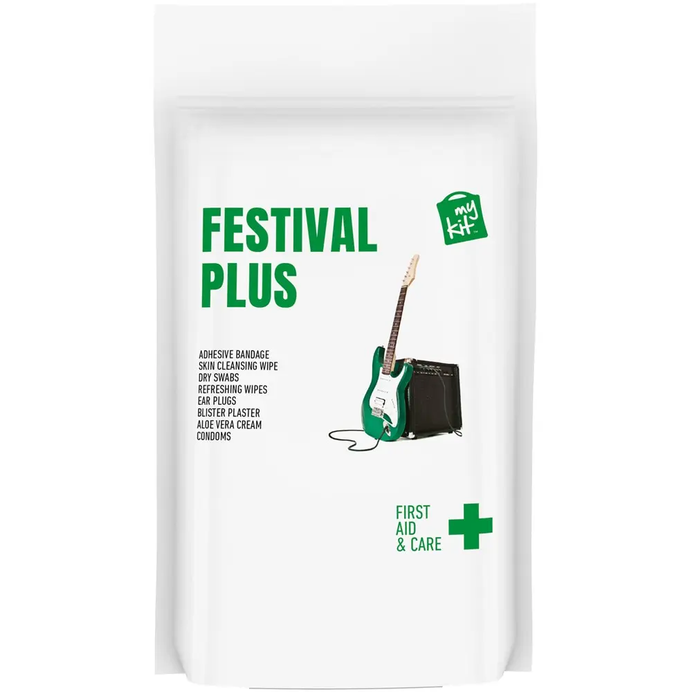 Ontdek de MyKit Festival set Plus met papieren stazak, uw ideale gepersonaliseerde EHBO-kit voor festivals en events. Deze compacte set (12 x 20,9 x 2,8 cm) bevat essentiële items om onverwachte situaties aan te pakken: 12 waterbestendige pleisters, 4 vochtige reinigingsdoekjes, 2 droge reinigingsdoekjes, 2 verfrissingsdoekjes, 2 condooms, 2 blarenpleisters, 1 aloe vera crème en 1 paar oordopjes. Alle producten voldoen aan EU-voorschriften en zijn vervaardigd van FSC-gecertificeerd papier, duurzaam gemaakt in Europa.