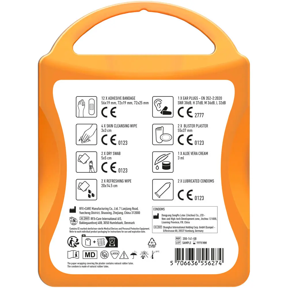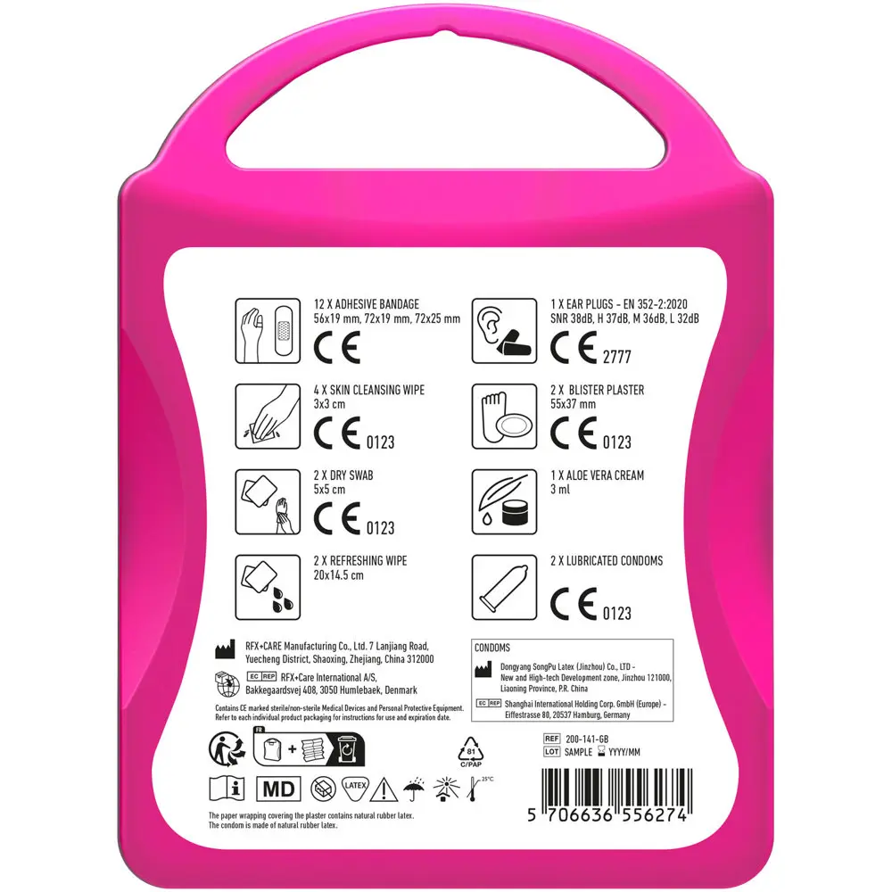 De inhoud omvat 12 waterbestendige pleisters, 4 vochtige reinigingsdoekjes, 2 droge reinigingsdoekjes, 2 verfrissingsdoekjes, 2 condooms, 2 blarenpleisters, 1 aloe vera crème en 1 paar oordopjes. Alle producten voldoen aan EU-voorschriften voor veilige eerste hulp en verzorging.