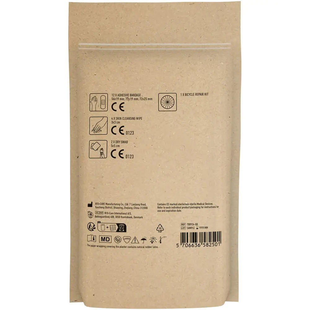 Of uw doelgroep nu avontuurlijke fietsers in de bergen of families op vakantie betreft, deze set zorgt voor snelle hulp bij kleine ongevallen of een lekke band. De inhoud omvat 12 waterbestendige pleisters, 4 vochtige reinigingsdoekjes, 2 droge reinigingsdoekjes en 1 fietsreparatiesetje. Alle artikelen voldoen aan de EU-regelgeving, zodat u veilig kunt personaliseren met uw logo in full colour.