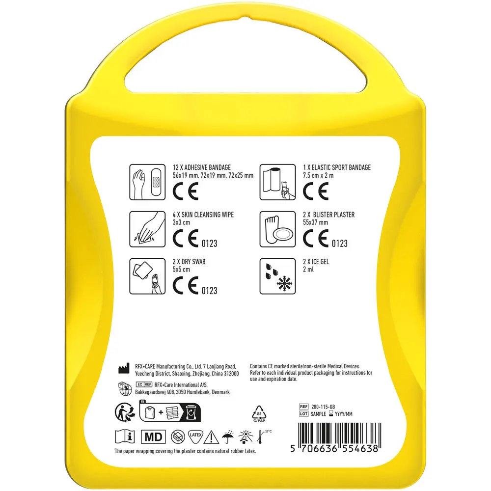 Ontdek de MyKit Sport set, uw ideale eerstehulpkit voor het snel behandelen van kleine sportongevallen. Deze compacte set (10 x 13,4 x 3 cm) bevat 12 waterbestendige pleisters, 4 vochtige reinigingsdoekjes, 2 droge reinigingsdoekjes, 2 ice gels, 2 blarenpleisters en 1 elastisch sportverband. Alle artikelen voldoen aan de EU-regelgeving en zijn verpakt in duurzame kunststof, geproduceerd in Europa.