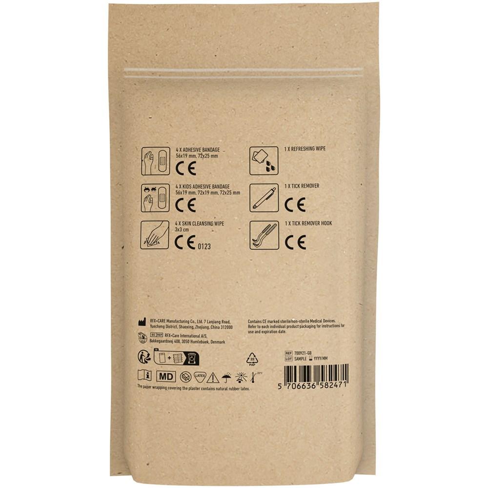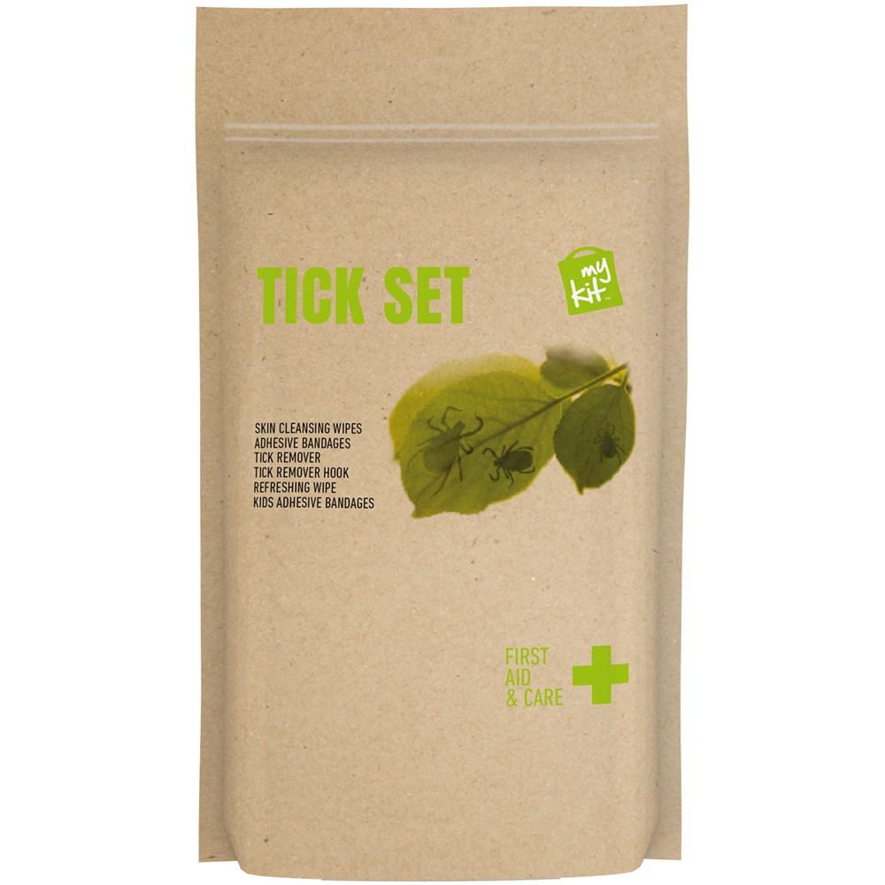 De perfecte kit voor het verwijderen van teken en het behandelen van hun beten bij mens en dier. Inhoud: 4 waterbestendige pleisters, 4 huidreinigingsdoekjes, 1 tekenverwijderaar blauw (mens), 1 tekenverwijderaar haak (oranje), 4 kinderpleisters, 1 verfrissend doekje. Alle eerstehulp- en verzorgingsproducten in de set voldoen aan alle geldende EU-voorschriften. Prijs is inclusief full colour bedrukking. Geleverd in een papieren stazak.