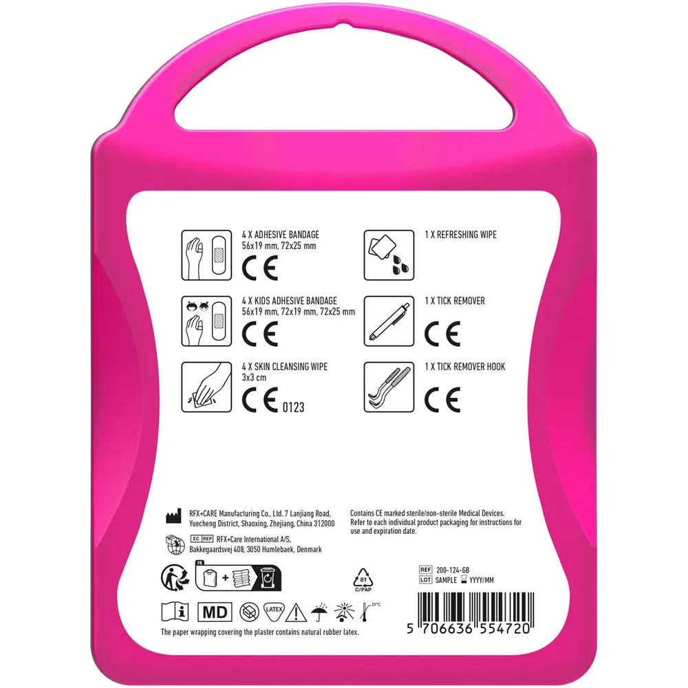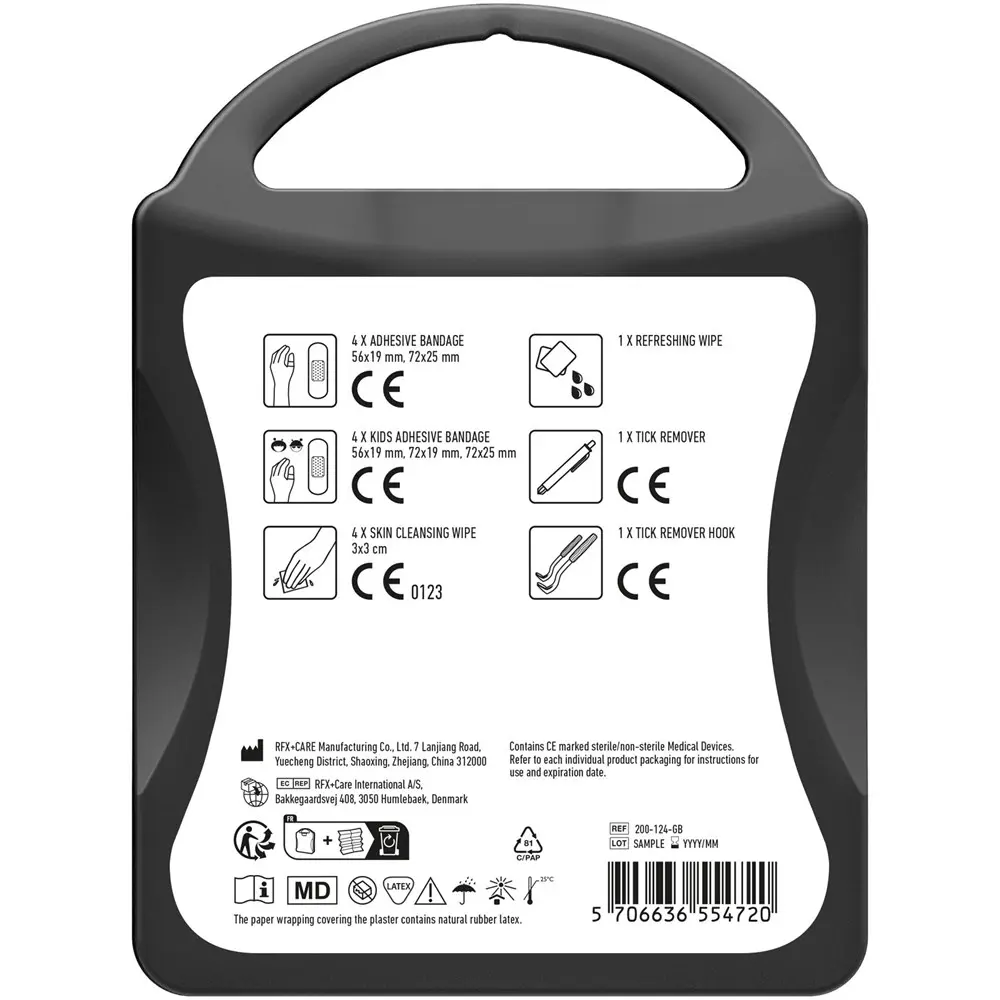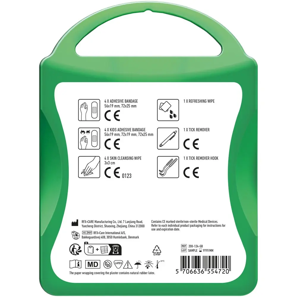 Ideaal als gepersonaliseerd relatiegeschenk met uw logo in full colour bedrukking, helpt deze kit uw merk te versterken bij events of als promotie. De robuuste kunststof verpakking (10 x 13,4 x 3 cm) is duurzaam geproduceerd in Europa, gemakkelijk mee te nemen en beschermt de inhoud optimaal. Voorkom complicaties door tekenbeten en toon uw zorg voor welzijn – perfect voor marketingacties in de natuur of bij sportevenementen.