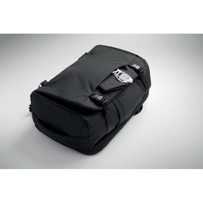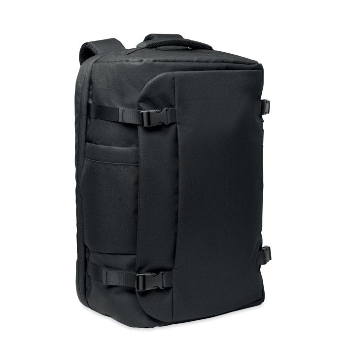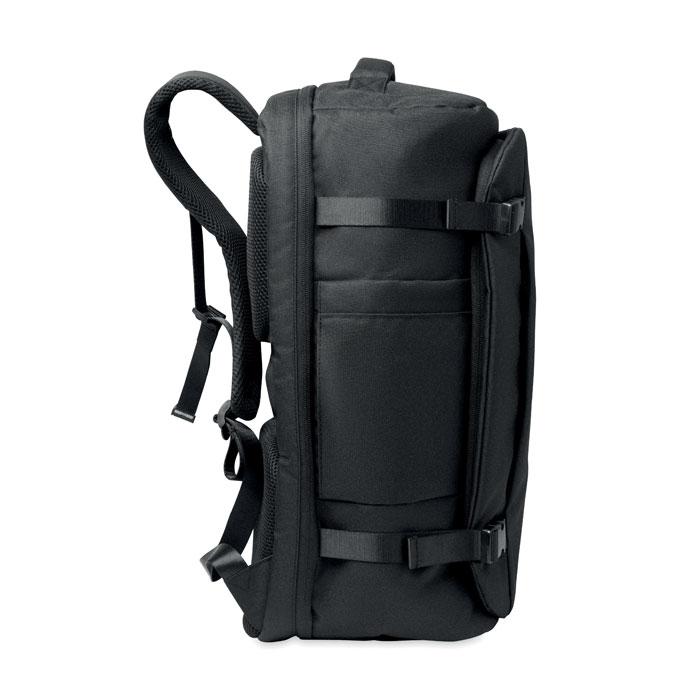 Grote 17 inch laptoprugzak van 600D RPET polyester. Voorzien van verschillende compartimenten zoals een hoofdcompartiment voor kleding, twee gevoerde compartimenten voor laptop en tablet en meer. Gewatteerd rugpaneel, schouderband, handgreep.