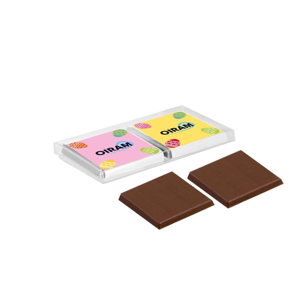 Transparant kunststof doosje met twee napolitains in melk chocolade met zilverfolie. De napolitains worden voorzien van een full colour bedrukte wikkel. Keuze uit 1 of 2 designs.