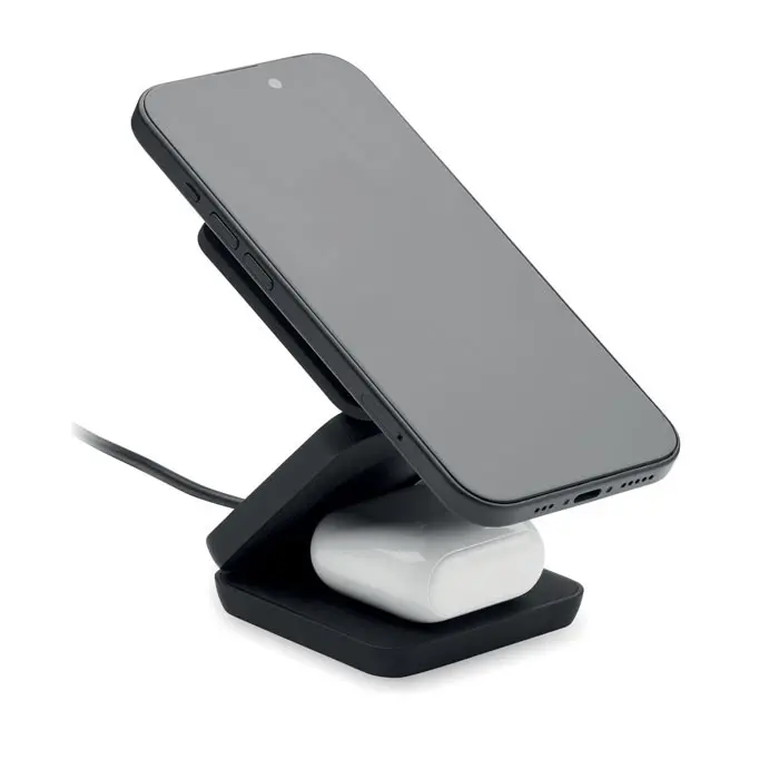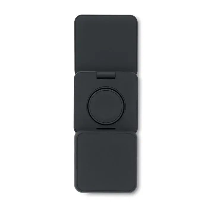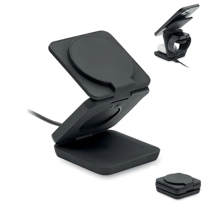 Ontdek ons veelzijdige 3-in-1 opvouwbaar laadstation, vervaardigd uit gerecycled ABS-materiaal met rubberen accenten. Dit duurzame product is perfect voor uw marketingcampagnes en events, waar het dient als gepersonaliseerd relatiegeschenk met logobedrukking. Het integreert een magnetische draadloze oplader van 15W, een oplader voor smartwatches (compatibel met Apple®) en een oplader voor TWS-oortjes, zodat uw ontvangers meerdere apparaten tegelijkertijd kunnen opladen.