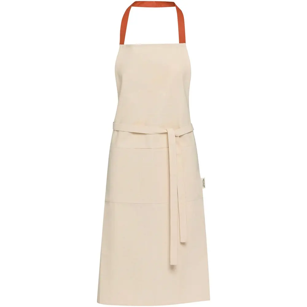 Ontdek het Nia schort, vervaardigd uit 100% GRS-gecertificeerd gerecycled katoen van 210 g/m², met een afmeting van 100 x 70 cm. Dit duurzame schort beschermt uw kleding betrouwbaar tijdens culinaire activiteiten en biedt praktische voordelen dankzij twee ruime zakken van samen 45 x 20 cm en een verstelbare striksluiting van 1 meter aan de achterzijde.