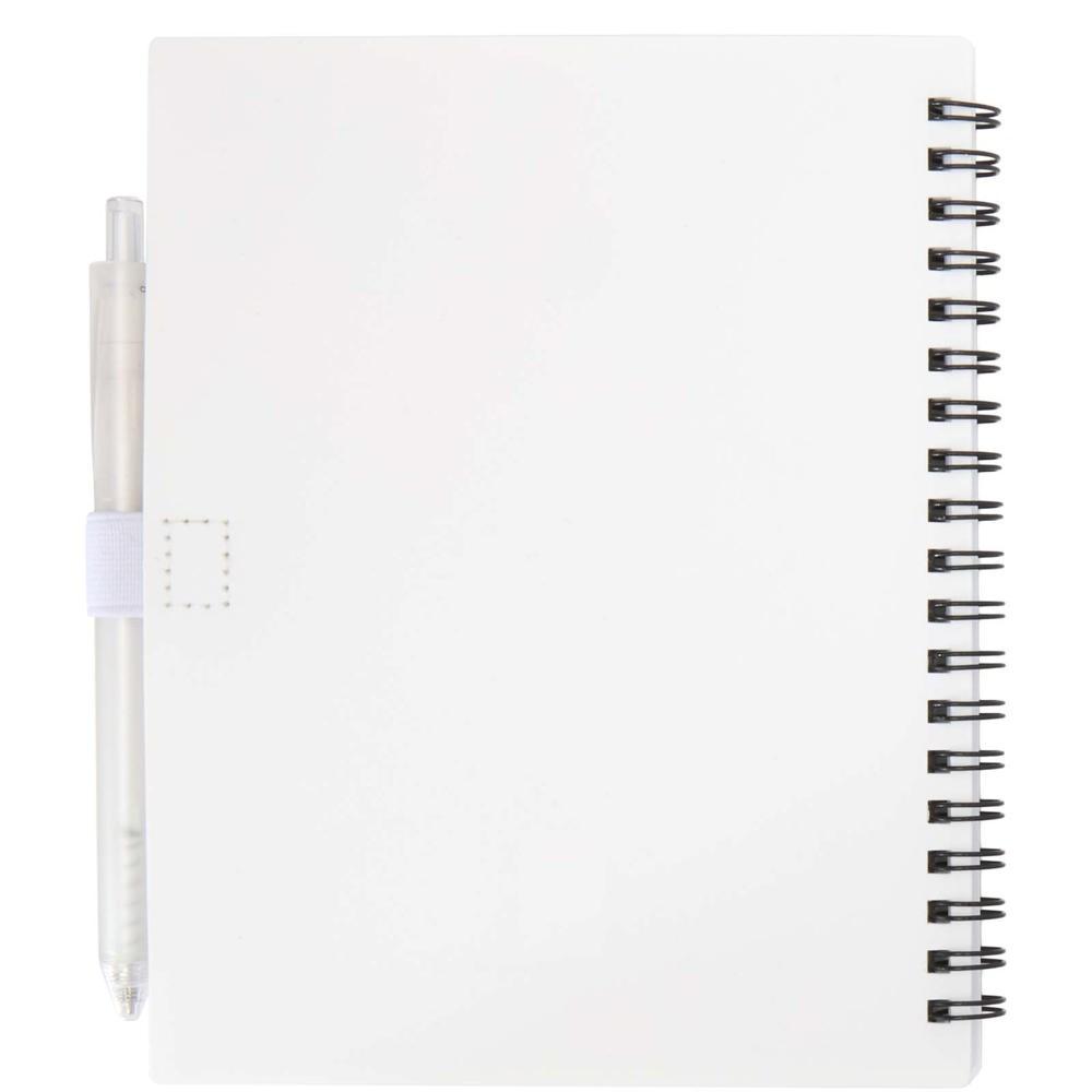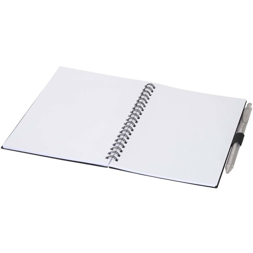 Je ontvangt een duurzaam notitieboek van gerecycled plastic met 70 gestippelde vellen papier van 70 g/m², vierkante hoeken en een handige lus voor de pen. Het compacte formaat van 140 x 178 mm past ideaal in elke tas. De balpen, eveneens van gerecycled plastic, schrijft vloeiend met een schrijflengte van 1000 meter en stiftmaat van 1,0 mm.