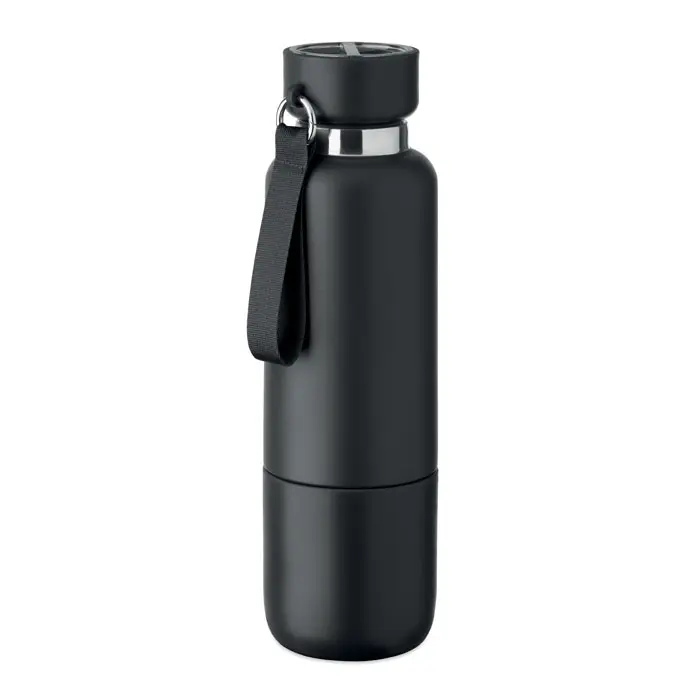 De fles biedt dubbele wandisolatie, waardoor uw drankjes urenlang koud of warm blijven – ideaal voor events of als dagelijks relatiegeschenk. Het geïntegreerde hengsel en de extra lange draaglus van 70 cm in het PP-deksel zorgen voor eenvoudig transport. Lekvrij ontwerp voorkomt morsen, en de ingebouwde beker in de bodem maakt het een praktisch cadeau voor onderweg.