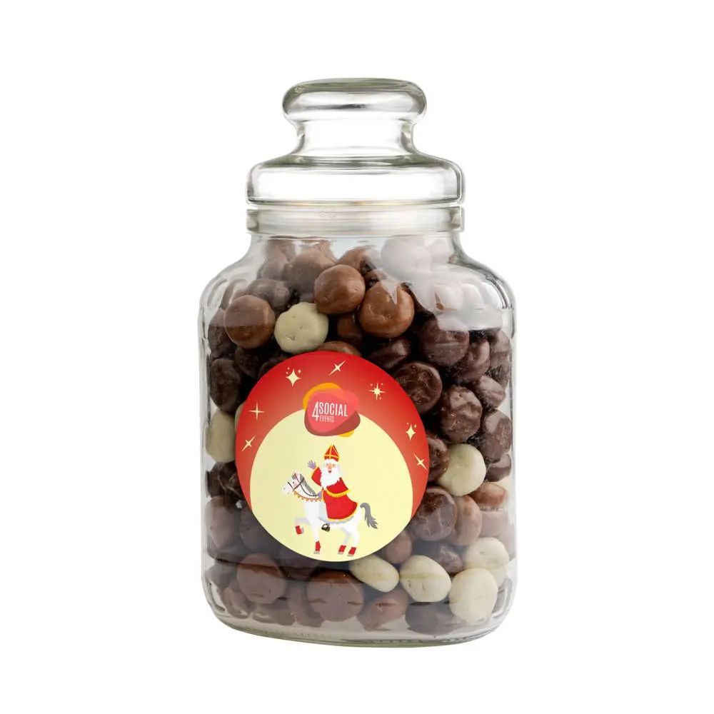 Ontdek onze nostalgische snoeppot, vervaardigd uit stevig glas en gevuld met circa 1200 gram smakelijke dropstaafjes mix. Personaliseer de pot met een full colour sticker op de voorzijde, inclusief uw bedrijfslogo, voor een uniek relatiegeschenk. Deze pot roept nostalgische gevoelens op en nodigt uit tot delen, ideaal voor events of als promotiemateriaal. Hij versterkt uw merkherkenning en creëert positieve associaties bij uw klanten. Bestel in grote aantallen voor optimale zichtbaarheid en betrokkenheid.