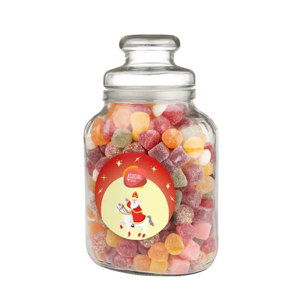 Ontdek deze klassieke glazen snoeppot, ideaal als relatiegeschenk voor uw bedrijf. De pot bevat ongeveer 1200 gram dropstaafjes mix en is voorzien van een full colour sticker op de voorzijde voor uw logo of boodschap.