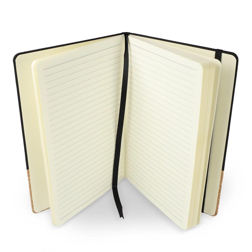 Dit notitieboek heeft een kaft van gerecycled PET en kurk met 80 gelinieerde vellen van 70 grams FSC-gecertificeerd papier. Het heeft een sluiting met elastiek en een bladwijzer met lint voor extra gemak. Gemaakt met R-PET.