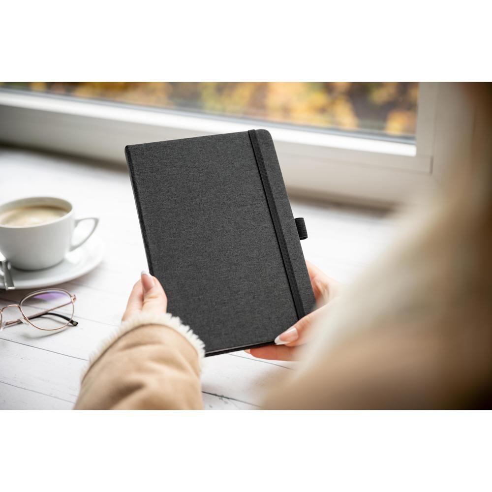 Ontdek dit elegante A5 notitieboek van hoogwaardig linnen (21 x 14 cm), perfect als gepersonaliseerd relatiegeschenk. Met geïntegreerd leeslint, pennenhouder en elastische sluitband blijft alles netjes georganiseerd.