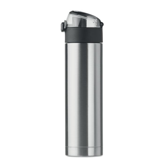 Dubbelwandige drinkfles van roestvrijstaal met deksel met veiligheidsslot. Makkelijk mee te nemen door de opvouwbare grip aan de bovenkant. 400 ml. Lekvrij. Lekvrij.