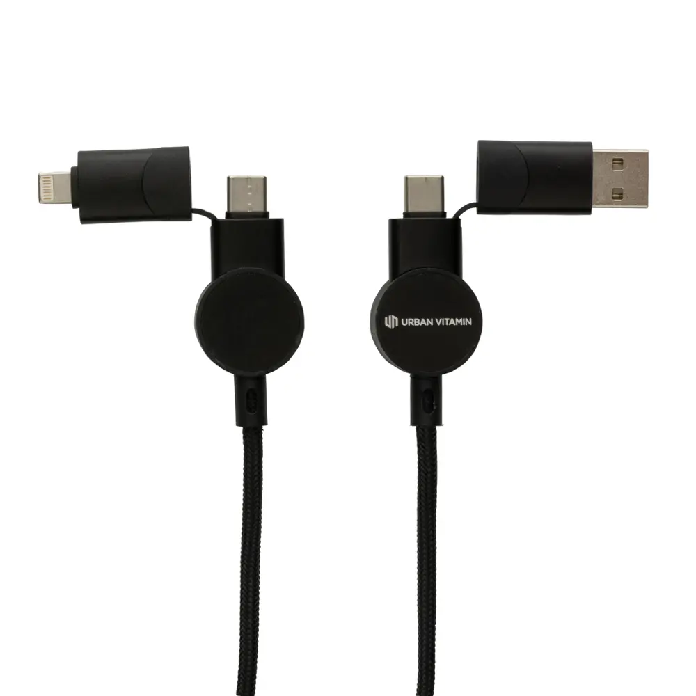 Ontdek de Oakland 6-in-1 snellaadkabel van 1,2 meter, ideaal als gepersonaliseerd relatiegeschenk voor uw bedrijf. Deze veelzijdige kabel laadt razendsnel op met maximaal 45W voor Type C en 18W voor iOS, en past perfect bij moderne apparaten zoals smartphones en MacBooks dankzij connectoren voor USB-C in/uit, USB-A in, iOS out en Micro-USB out. Gemaakt van 100% RCS-gecertificeerd gerecycled plastic, TPE en PET, met 52% gerecycled materiaal, voldoet hij aan strenge normen voor duurzaamheid en veiligheid, inclusief REACH en ftalaatvrij. PVC-vrij en in plasticarme verpakking, ondersteunt hij uw groene imago. Personaliseer hem met uw logo om uw merk te promoten bij events of klanten – een praktisch en milieuvriendelijk cadeau dat indruk maakt.