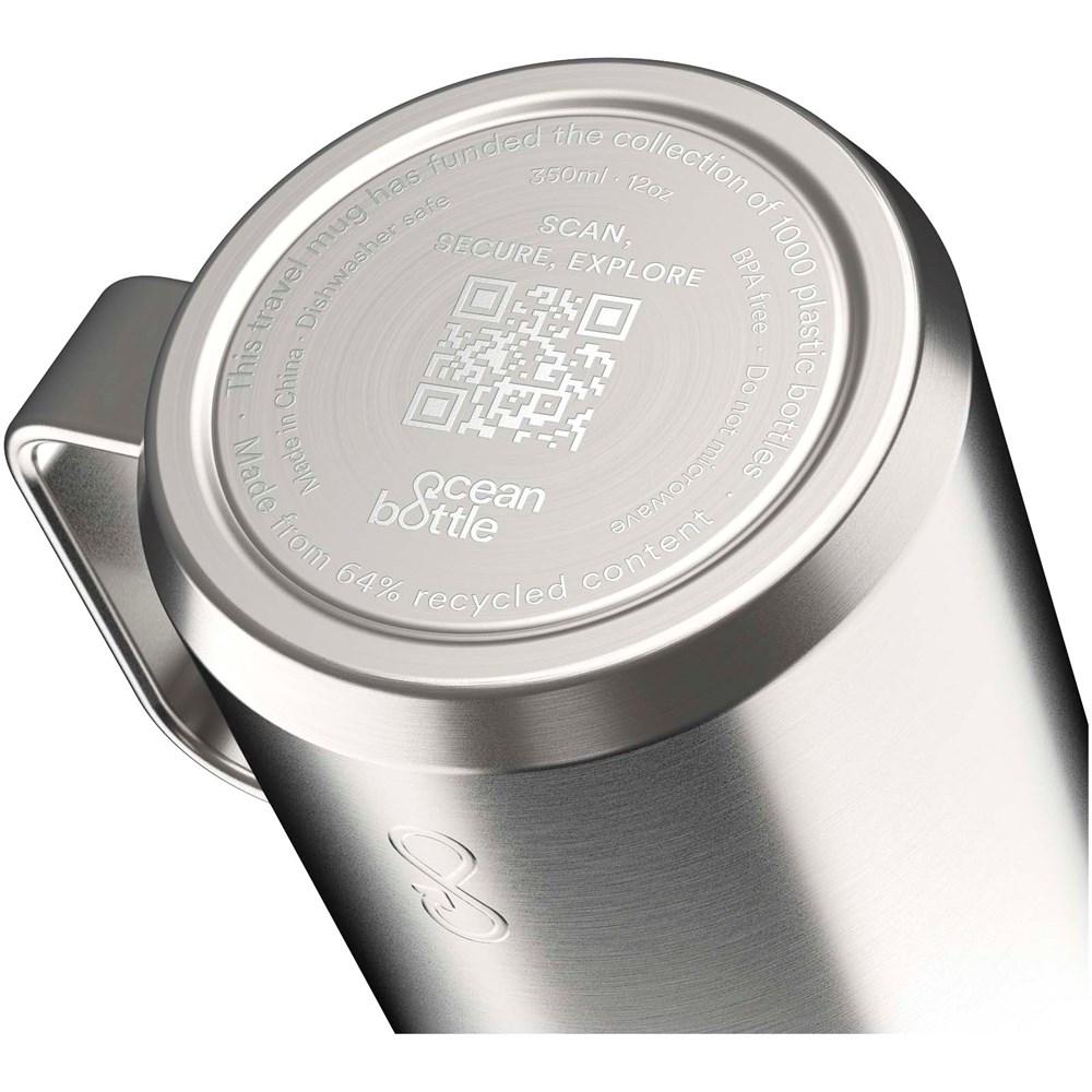 De Ocean Bottle reismok van 350 ml heeft dubbelwandige isolatie om dranken tot vier uur warm en tot tien uur koud te houden. Met de ergonomische handgreep kun je het aan tassen of andere voorwerpen bevestigen om de opslagruimte en draagcapaciteit te optimaliseren. Elke reismok is volledig CO2-neuttraal en bestaat uit 1000 plastic flessen om het leefklimaat in kustgemeenschappen te verbeteren. De mok is gemaakt van 90% gerecycled roestvrij staal en andere gerecyclede materialen. Gepresenteerd in een verantwoord geproduceerde, gerecyclede kartonnen geschenkverpakking.