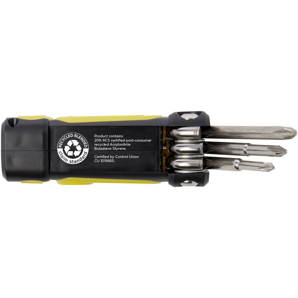 De Octo 8-in-1 schroevendraaierset met zaklamp is een compact en veelzijdig relatiegeschenk, ideaal voor uw marketingacties of events. Gemaakt van gerecycled ABS-kunststof met 20% RCS-gecertificeerd materiaal, voldoet dit product aan hoge duurzaamheidsnormen en ondersteunt uw groene imago.