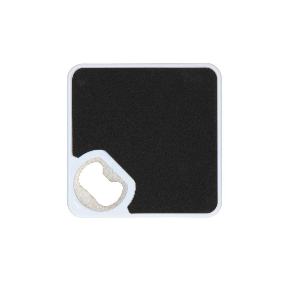 Ontdek deze praktische 2-in-1 onderzetter en flesopener, perfect als gepersonaliseerd relatiegeschenk. Je hebt een stevige kunststof onderzetter met EVA-laag onderaan, zodat hij niet wegglijdt op tafel. De ingebouwde metalen flesopener opent moeiteloos elke fles.