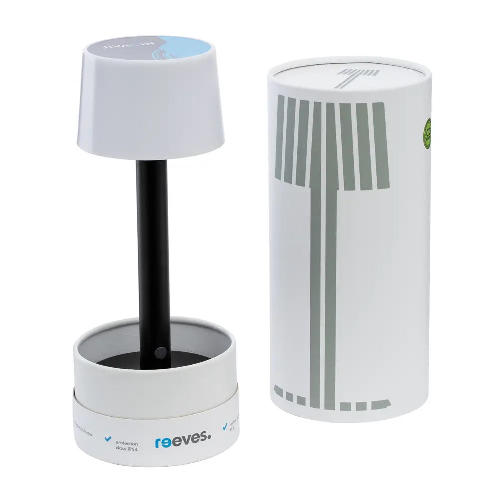 De oplaadbare tafellamp REEVES-AMLINO uit aluminium en kunststof is een stijlvolle eyecatcher voor uw events of als relatiegeschenk. Of u hem binnen of buiten inzet, hij creëert een warme, gezellige sfeer en biedt een touch-to-light functie voor eenvoudig bediening. Met 200 lumen wit LED-licht zorgt hij voor optimale verlichting.
