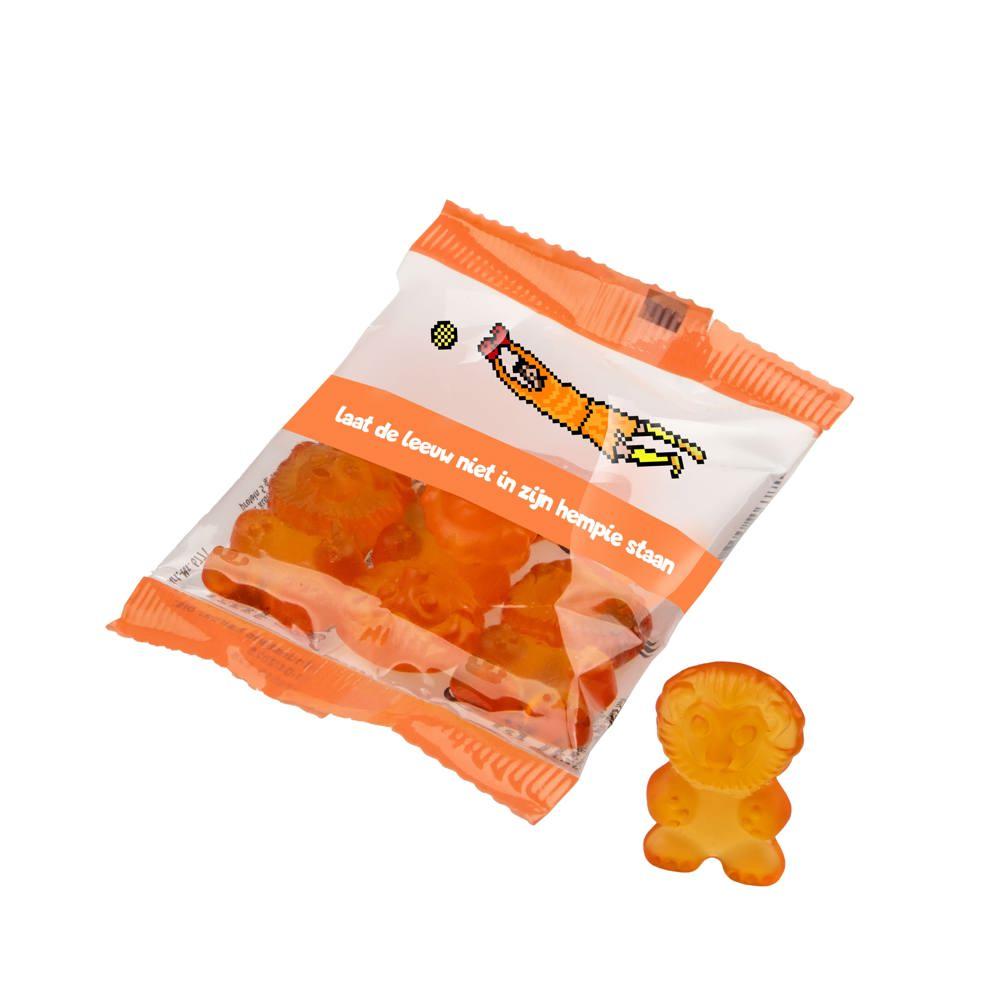 XXL vruchtengummie in transparante folie, gevuld met ca. 20g oranje XXL leeuwen