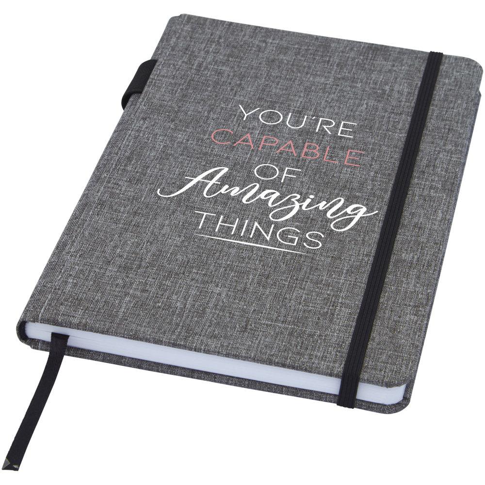 Ontdek het Orin A5 notitieboek, perfect als gepersonaliseerd relatiegeschenk met jouw logo. De cover van duurzame RPET-stof combineert stijl met milieubewustzijn, ideaal voor marketingacties en events.