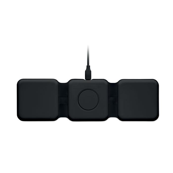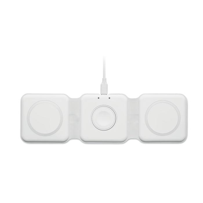 3 in 1 opvouwbaar oplaadstation van ABS. Het heeft 3 draadloze oplaadpunten (15w). Ingang: 2-in-1 Type-C en Type-A.