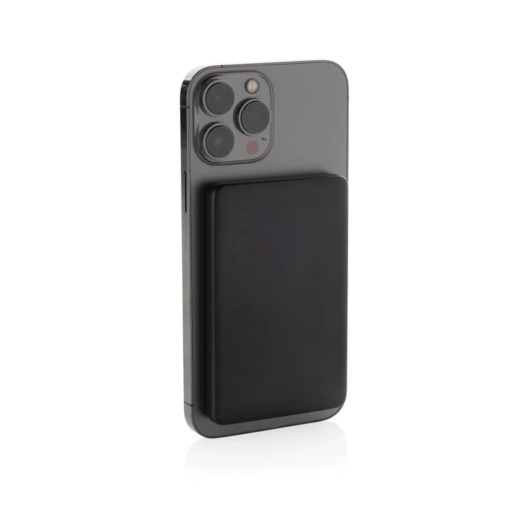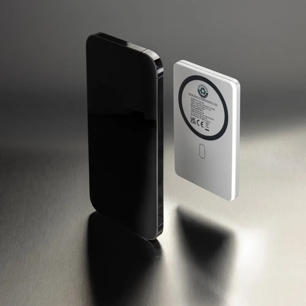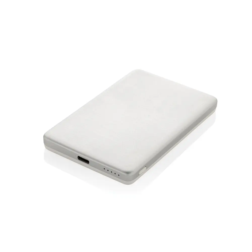 Deze powerbank biedt meerdere voordelen voor uw onderneming. De magnetische draadloze oplading maakt opladen eenvoudig en handsfree, perfect voor mobiele professionals tijdens events. Met Type-C input (5V/2.4A) en USB-C output (5V/2A) laadt u snel meerdere apparaten op. PVC-vrij en inclusief RCS-gecertificeerde gerecyclede TPE-oplaadkabel, ondersteunt het uw duurzame imago. Verpakt in FSC® mix verpakking, is het klaar voor personalisatie met uw logo, wat uw merk versterkt bij klanten en relaties.