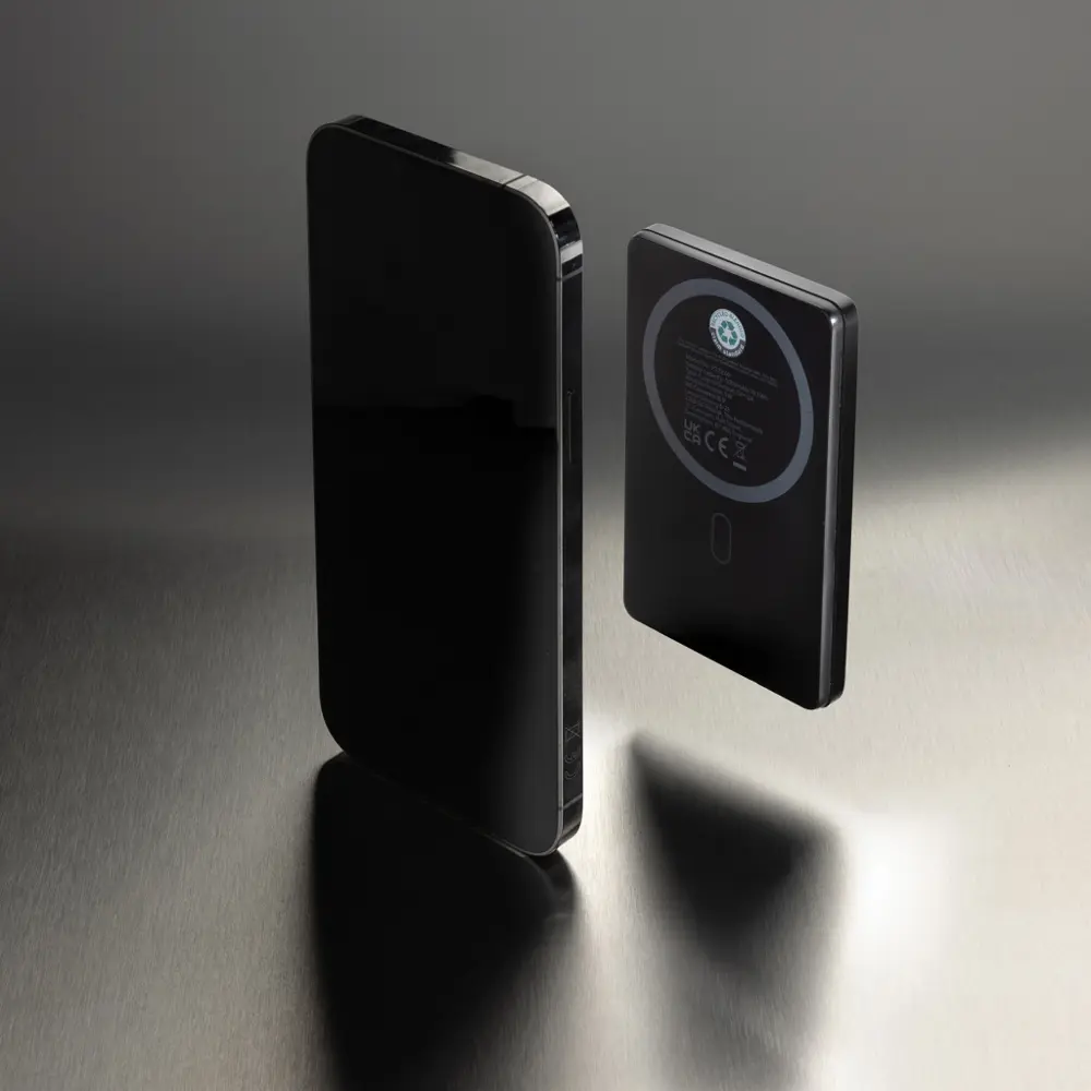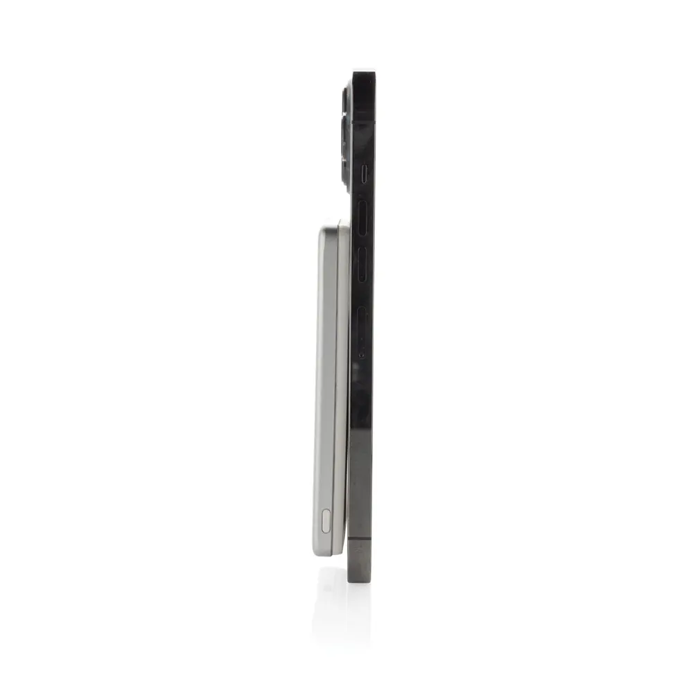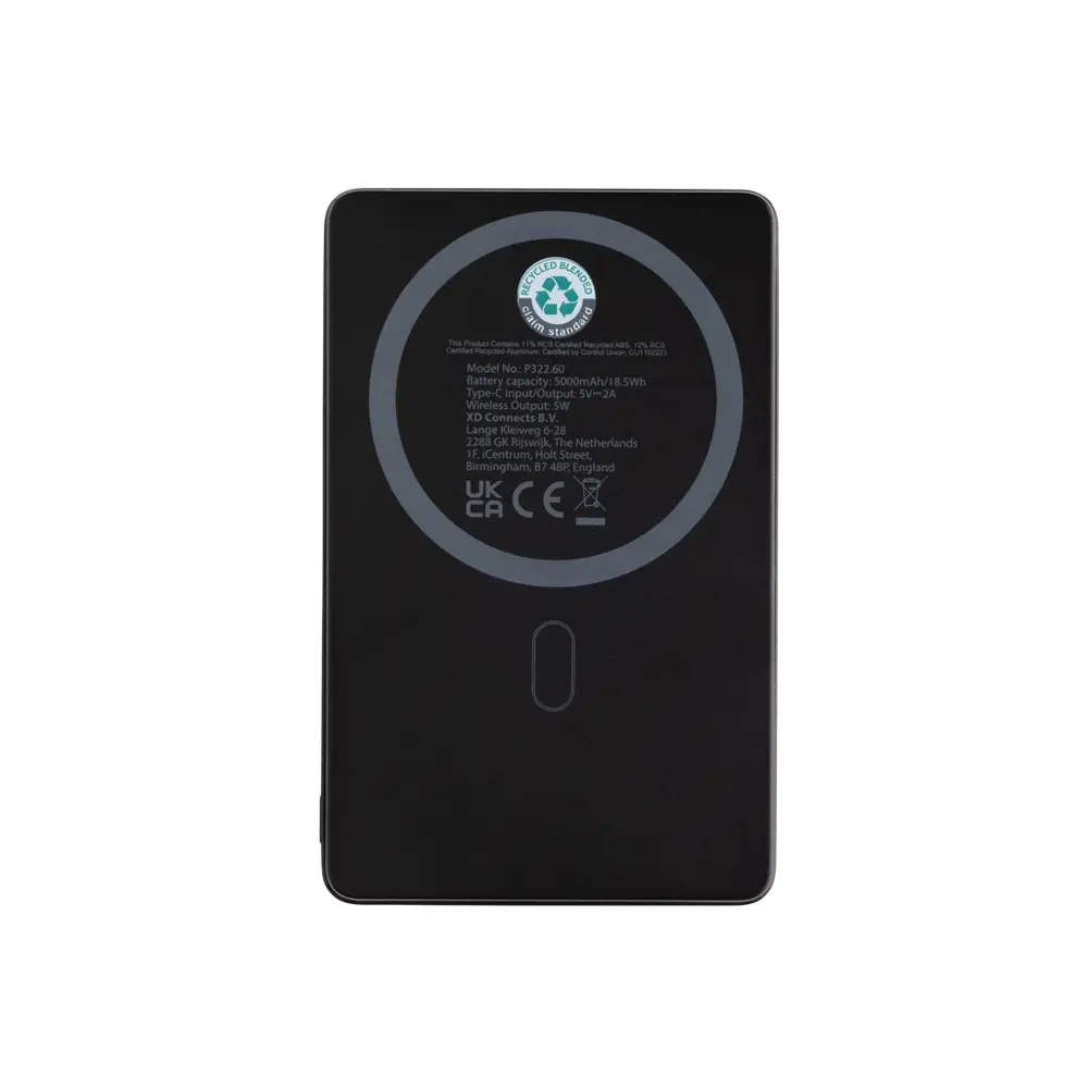 Ontdek deze ultradunne powerbank met ingebouwde 5W magnetische draadloze oplader, ideaal voor uw marketingacties en relatiegeschenken. Gemaakt van RCS-gecertificeerd gerecycled aluminium en gerecycled ABS-plastic, voldoet het product aan strenge normen voor gerecycled gehalte: 23% op basis van het totale gewicht. De duurzame grade A 5.000 mAh lithium-polymeerbatterij zorgt voor betrouwbare energie, terwijl stroomindicatoren u altijd op de hoogte houden van het resterende niveau.