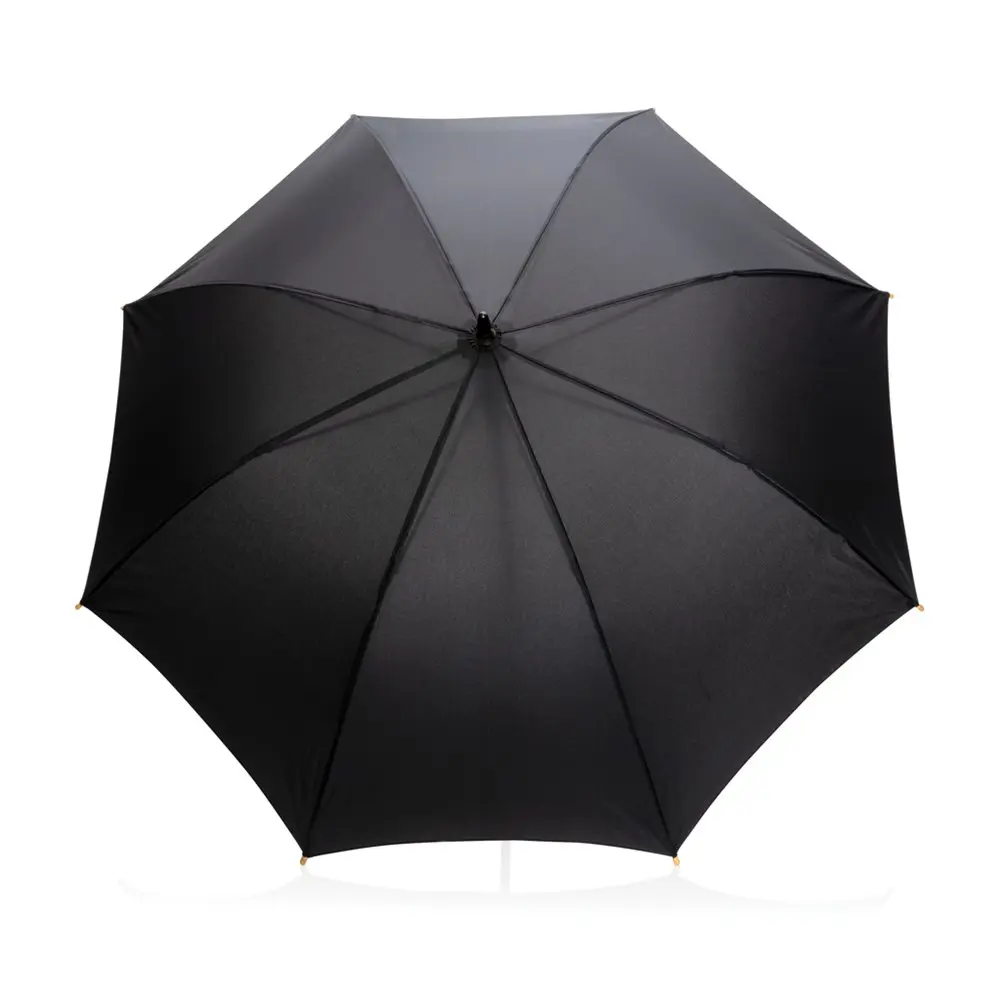 Met een diameter van 105 cm biedt deze 23 inch paraplu optimale bescherming tegen regen en wind, dankzij het metalen frame, glasvezelribben en comfortabel bamboe handvat. Automatisch openen en manueel sluiten zorgt voor gebruiksgemak. Ideaal als gepersonaliseerd relatiegeschenk met uw logo: versterk uw merk met een eerlijk, ecologisch verhaal dat uw klanten aanspreekt en uw imago boost. Voldoet aan strenge normen zoals REACH en REACH ZEK 01-4-08 voor veiligheid.