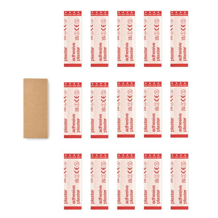 15 stuks pleisters in een doosje van gerecycled papier. Niet te koop in Zwitserland.