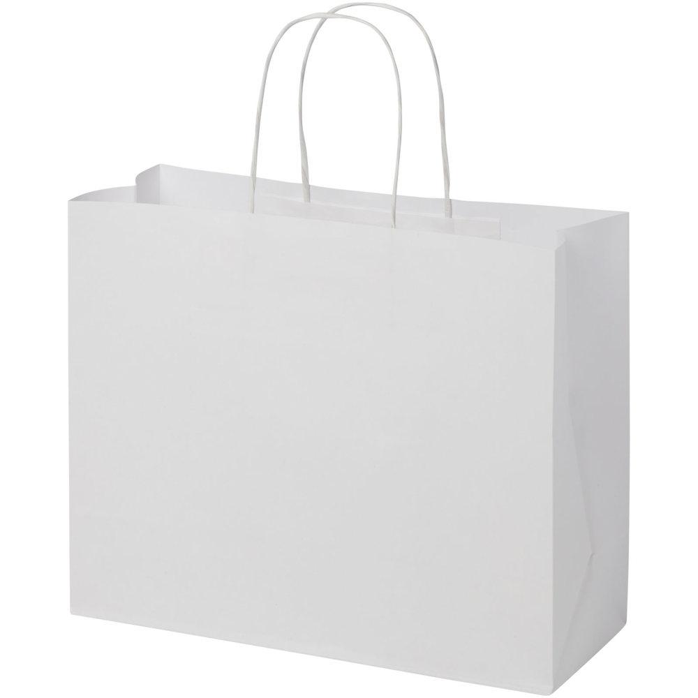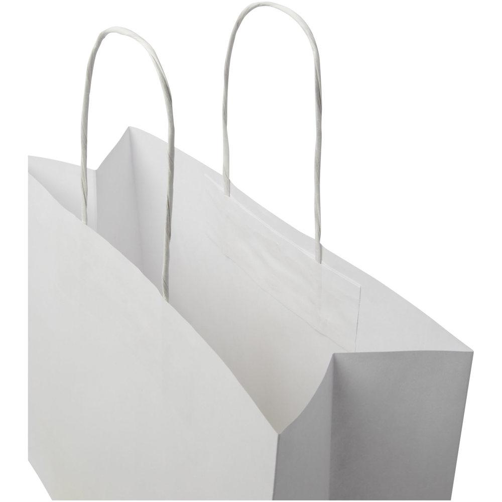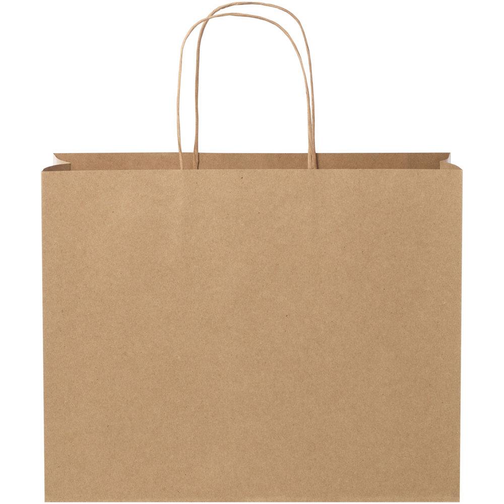 Grote tas van kraftpapier (31 x 12 x 25 cm) van 120 g/m2 met gedraaide papieren handgrepen. De aanpasbare voor- en achterkant bieden voldoende ruimte voor het afdrukken van een logo of een ander ontwerp, waardoor het een uitstekende zakelijke marketingtool is. Gemaakt in Europa en 100 % recyclebaar, waardoor deze tas een duurzamere keuze is voor milieubewuste bedrijven en mensen die op zoek zijn naar een duurzame verpakkingsoplossing.