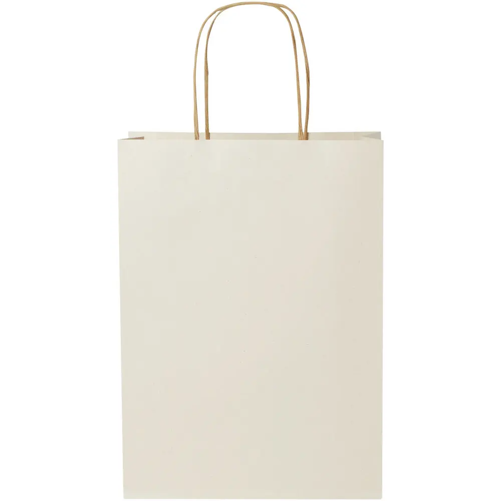 Ontdek onze medium papieren tas van 150 g/m², vervaardigd uit landbouwafval. Met afmetingen van 24 x 9 x 32 cm en gedraaide papieren handgrepen biedt deze tas een praktische en robuuste oplossing voor uw bedrijfsverpakkingen. De aanpasbare voor- en achterzijde voorzien in ruime mogelijkheden voor logobedrukking of een uniek ontwerp, ideaal als relatiegeschenk tijdens events of als reclame-uitdeelmateriaal.