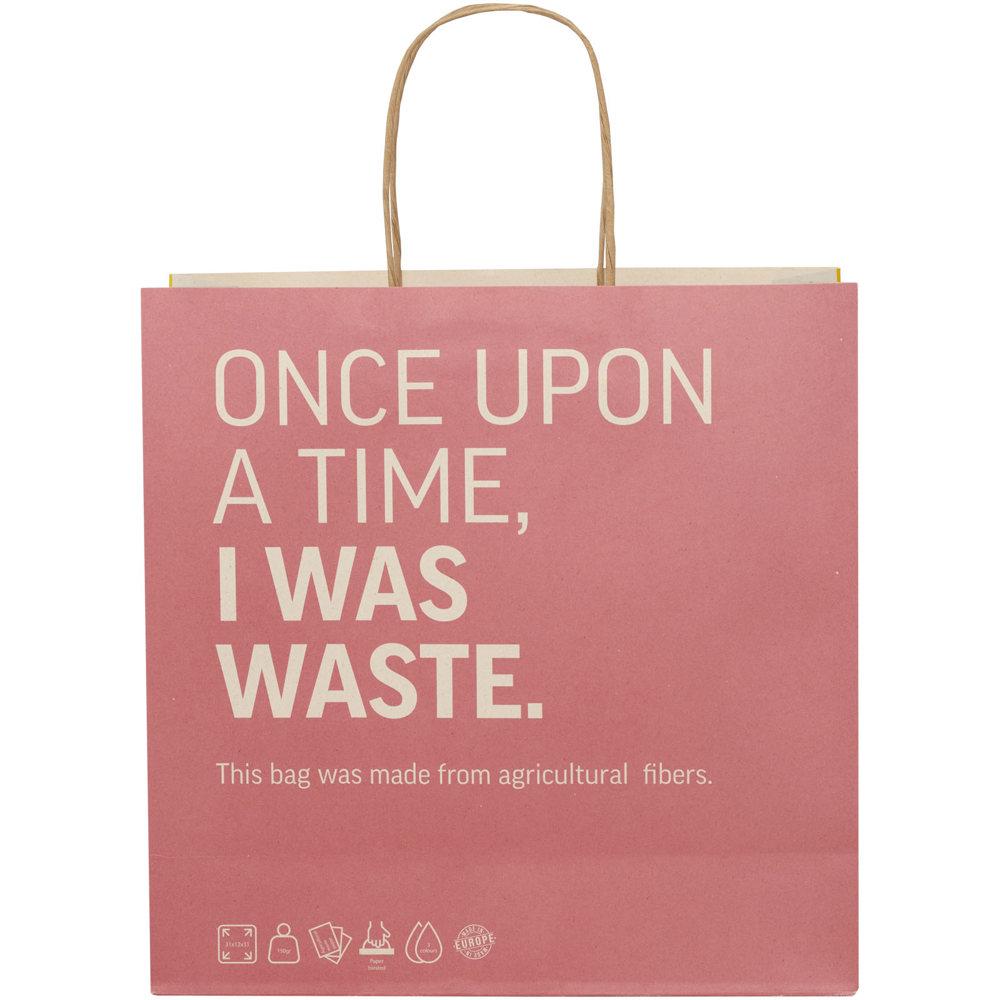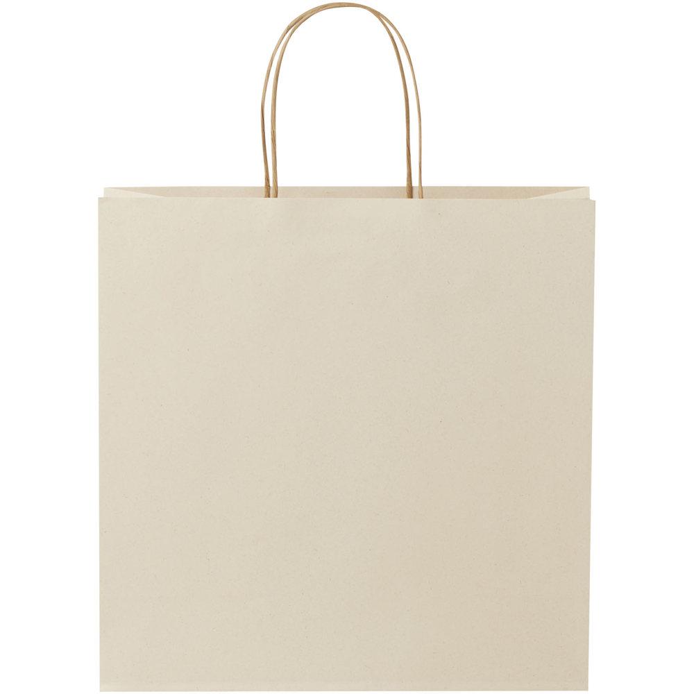 XL 150 g/m2 papieren tas (31 x 12 x 31 cm) gemaakt van landbouwafval met gedraaide papieren handgrepen. De aanpasbare voor- en achterkant bieden voldoende ruimte voor het afdrukken van een logo of een ander ontwerp, waardoor het een uitstekende zakelijke marketingtool is. Gemaakt in Europa en 100 % recyclebaar, waardoor deze tas een duurzamere keuze is voor milieubewuste bedrijven en mensen die op zoek zijn naar een duurzame verpakkingsoplossing.