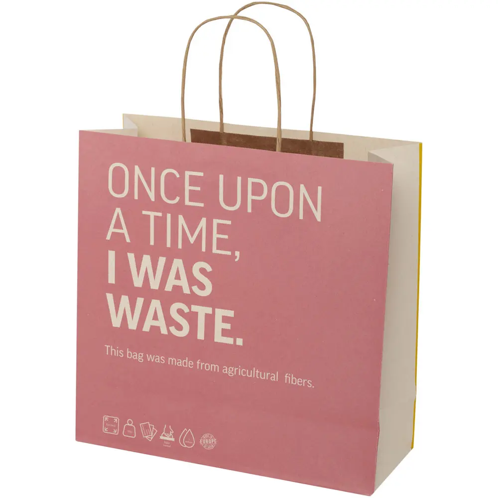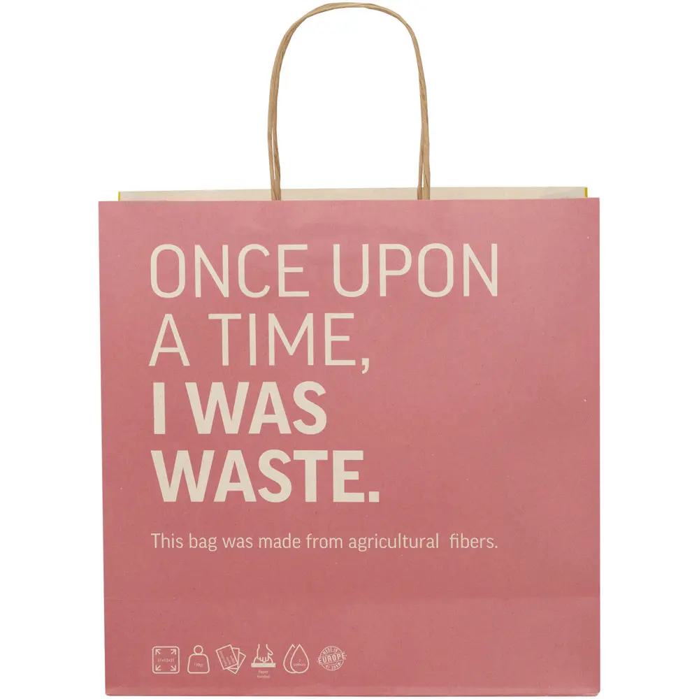 Ontdek onze duurzame papieren tas van 150 g/m², vervaardigd uit landbouwafval met gedraaide handgrepen. Met afmetingen van 31 x 12 x 31 cm biedt deze tas ruime capaciteit voor uw promotiemateriaal of geschenken tijdens events. De aanpasbare voor- en achterzijde zorgen voor optimale personalisatie met uw logo of ontwerp, ideaal als krachtige marketingtool voor bedrijven.