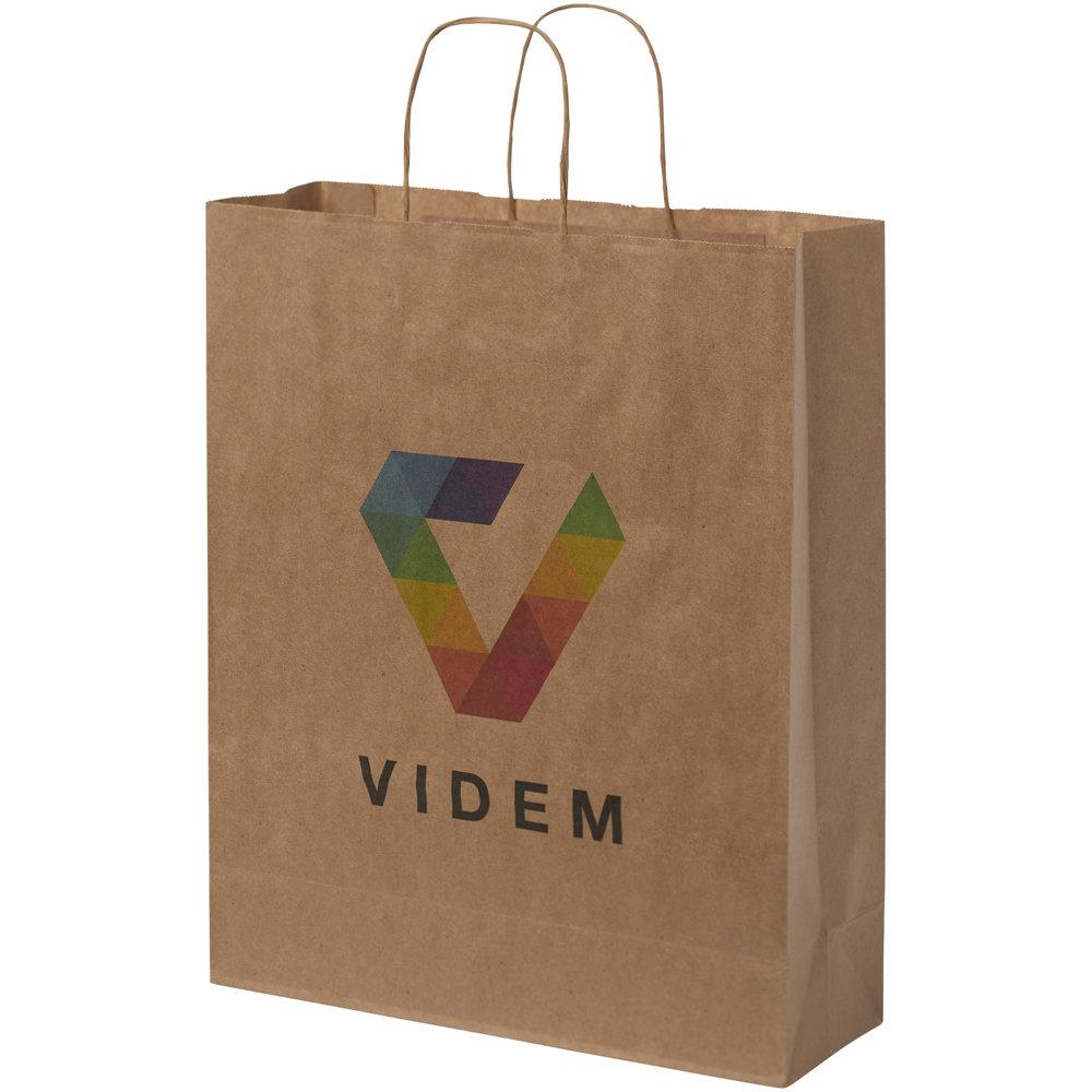 Je kiest met deze papieren tas van kraftpapier (32 x 12 x 40 cm) voor een duurzame en praktische oplossing als relatiegeschenk. Gemaakt in Europa van papier uit verantwoorde herkomst (80-90 g/m²) met stevige gedraaide handvaten, biedt ze ruim voldoende volume voor boodschappen, cadeaus of event giveaways.