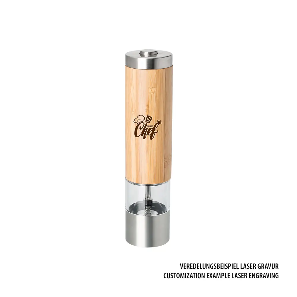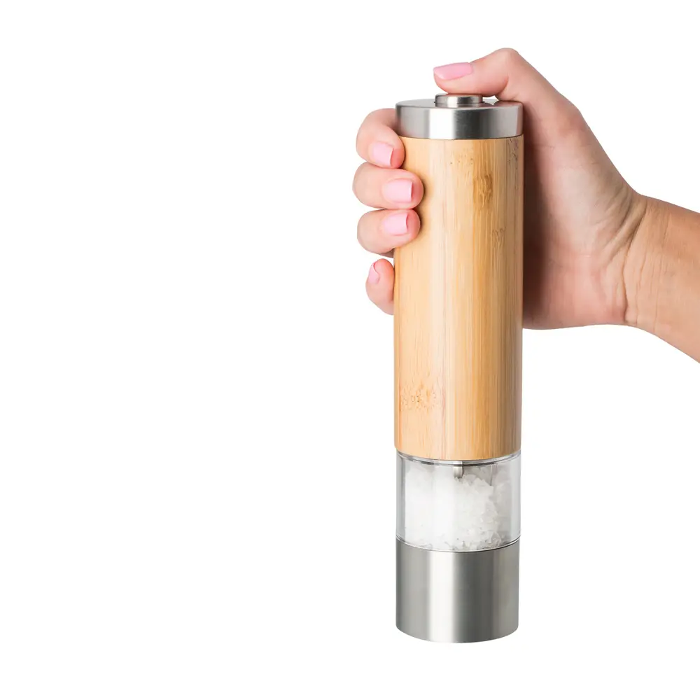 Ontdek onze elektrische kruidenmolen, perfect als gepersonaliseerd relatiegeschenk voor uw bedrijf. Gemaakt van duurzame bamboe en robuust roestvrij staal, biedt dit product een elegante uitstraling die uw merk versterkt. Met de mogelijkheid tot logobedrukking, wordt het een ideaal item om uit te delen tijdens events of als dankbetuiging aan uw klanten.