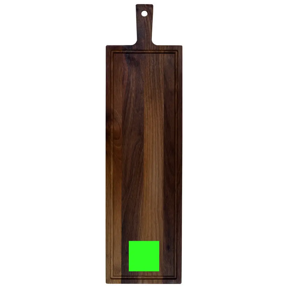 Ontdek onze gepersonaliseerde walnoot serveerplank met handvat en sapgeul, het perfecte relatiegeschenk voor uw marketingcampagnes of events. Gemaakt van hoogwaardig, bio walnotenhout en afgewerkt met olie voor optimale bescherming tegen vocht en vuil, biedt deze plank duurzaamheid en een elegante uitstraling.