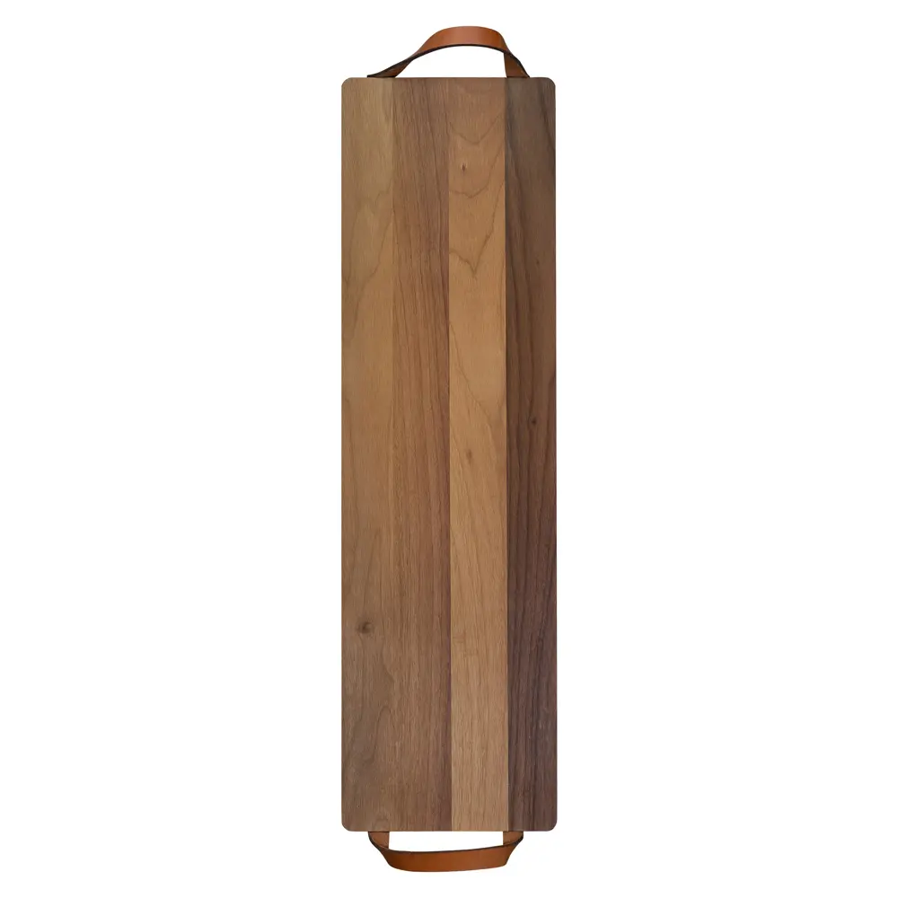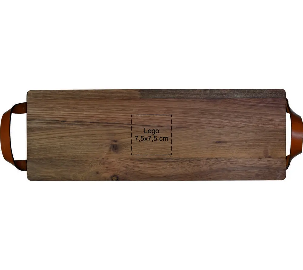 Ontdek deze elegante plank uit walnoothout met lederen handvaten, ideaal als gepersonaliseerd relatiegeschenk. Met logobedrukking voegt u uw bedrijfsmerk toe, wat zorgt voor een professionele en herkenbare indruk bij uw klanten. De afmetingen van 69 bij 19 cm bieden ruim voldoende plaats voor hapjes, kaasplankjes of andere lekkernijen, perfect voor events en promotionele uitdelingen.