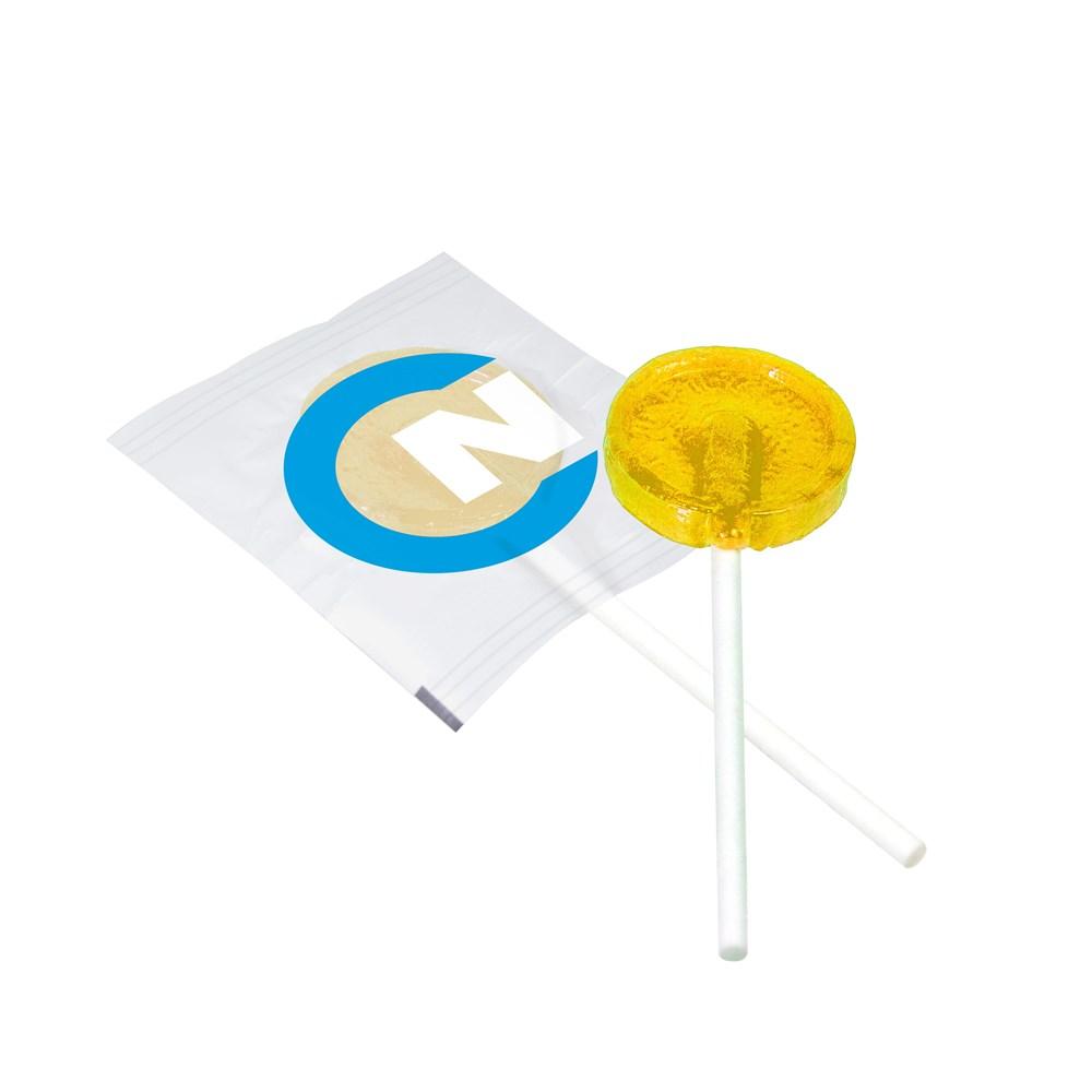 Platte lolly van ca. 5,5 gram in witte folie, met kersen smaak, voorzien van een all-over bedrukking aan de voorzijde. De achterzijde wordt repeterend bedrukt of is transparant