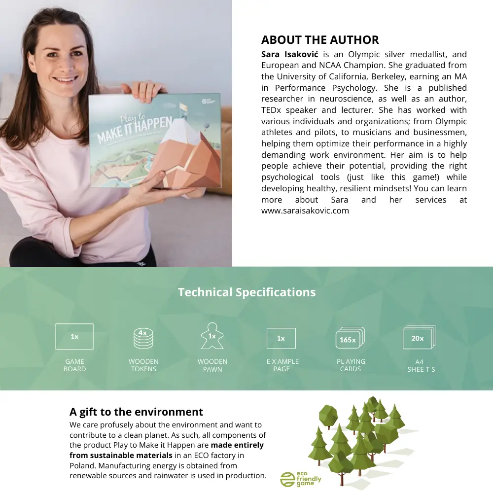 De maker, Sara Isaković, is een olympisch zilveren medaillewinnares, Europees kampioene en drievoudig NCAA-kampioene. Ze studeerde psychologie aan de University of California, Berkeley, en behaalde een master in performance psychology in San Diego. Als onderzoeker in neurowetenschappen, auteur, TEDx-spreker en keynote speaker inspireert ze mensen om moedig, bewust en doelgericht te leven. Haar expertise maakt dit bordspel een betrouwbare tool voor persoonlijke en professionele groei.