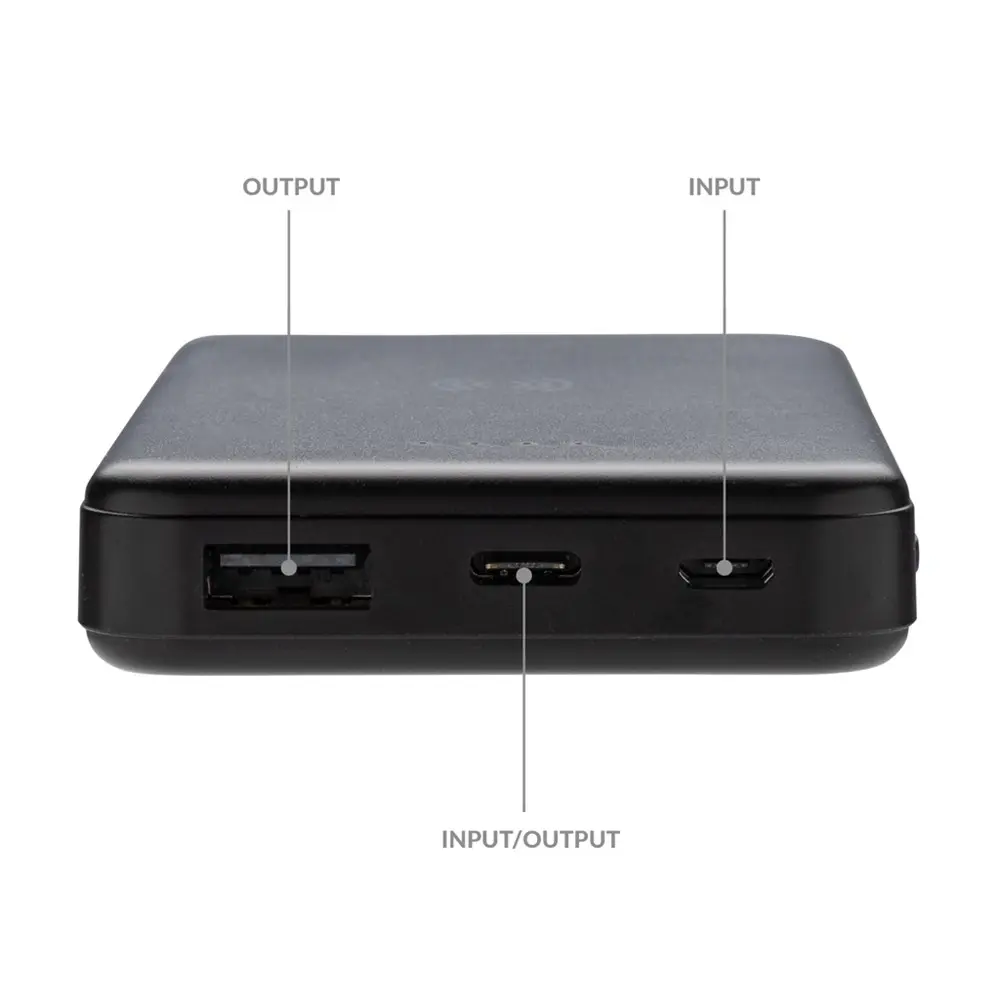 - Uitgangen: USB (5V/2.4A), Type-C (5V/2A)