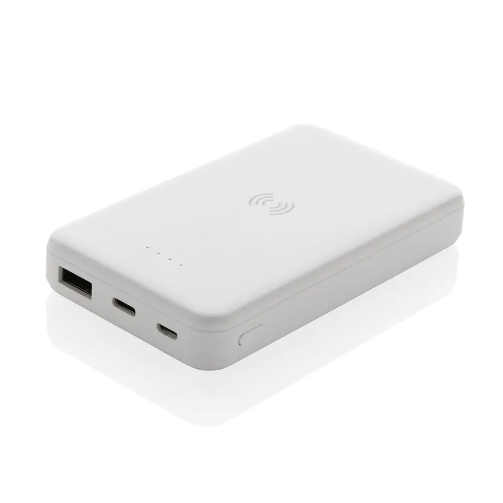 Ontdek deze compacte powerbank met geïntegreerde 5W draadloze oplader, ideaal voor uw marketingacties en bedrijfsevenementen. Gemaakt van RCS-gecertificeerd gerecycled ABS-plastic, bevat het 26% gerecycled materiaal op basis van het totale gewicht. Dit maakt het een milieuvriendelijke keuze die uw merk positioneert als duurzaam en innovatief.
